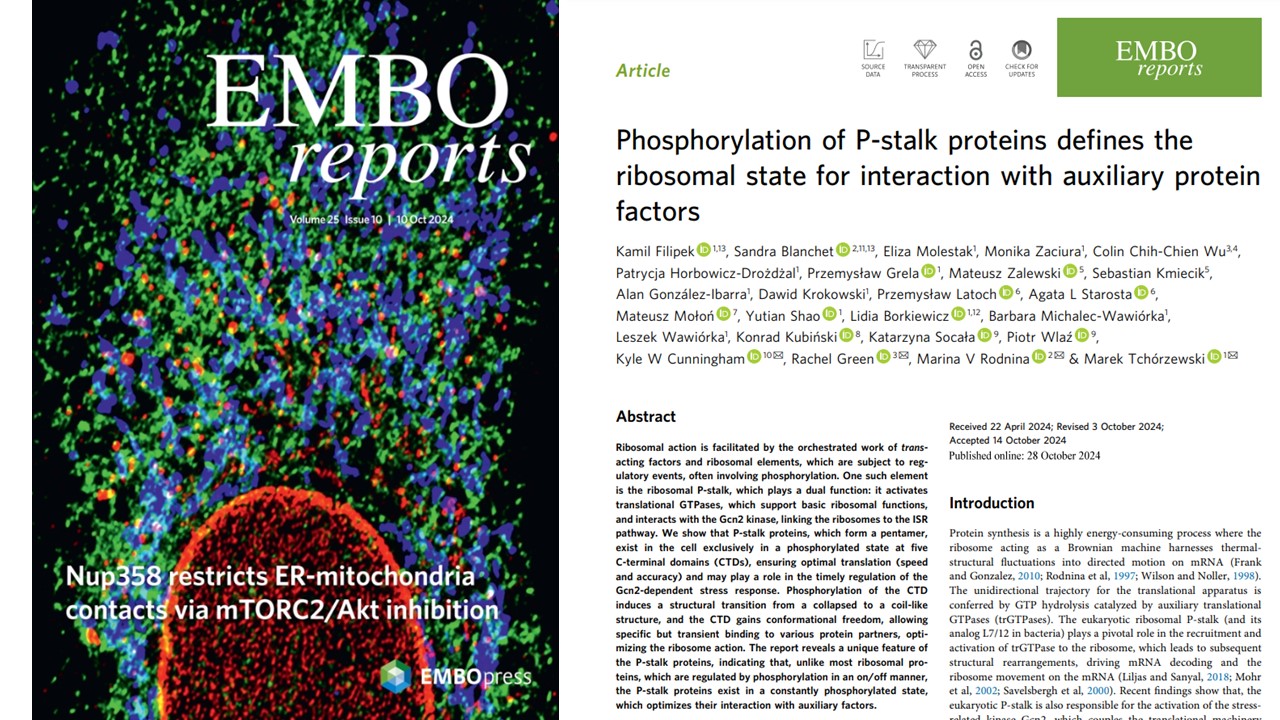Jest nam niezmiernie miło poinformować, że dr hab. Mateusz Mołoń, prof. UR został jednym ze współautorów publikacji „Phosphorylation of P-stalk proteins defines the ribosomal state for interaction with auxiliary protein factors” w prestiżowym czasopiśmie EMBO Reports (IF=6.5; 140 pkt MNiSW).