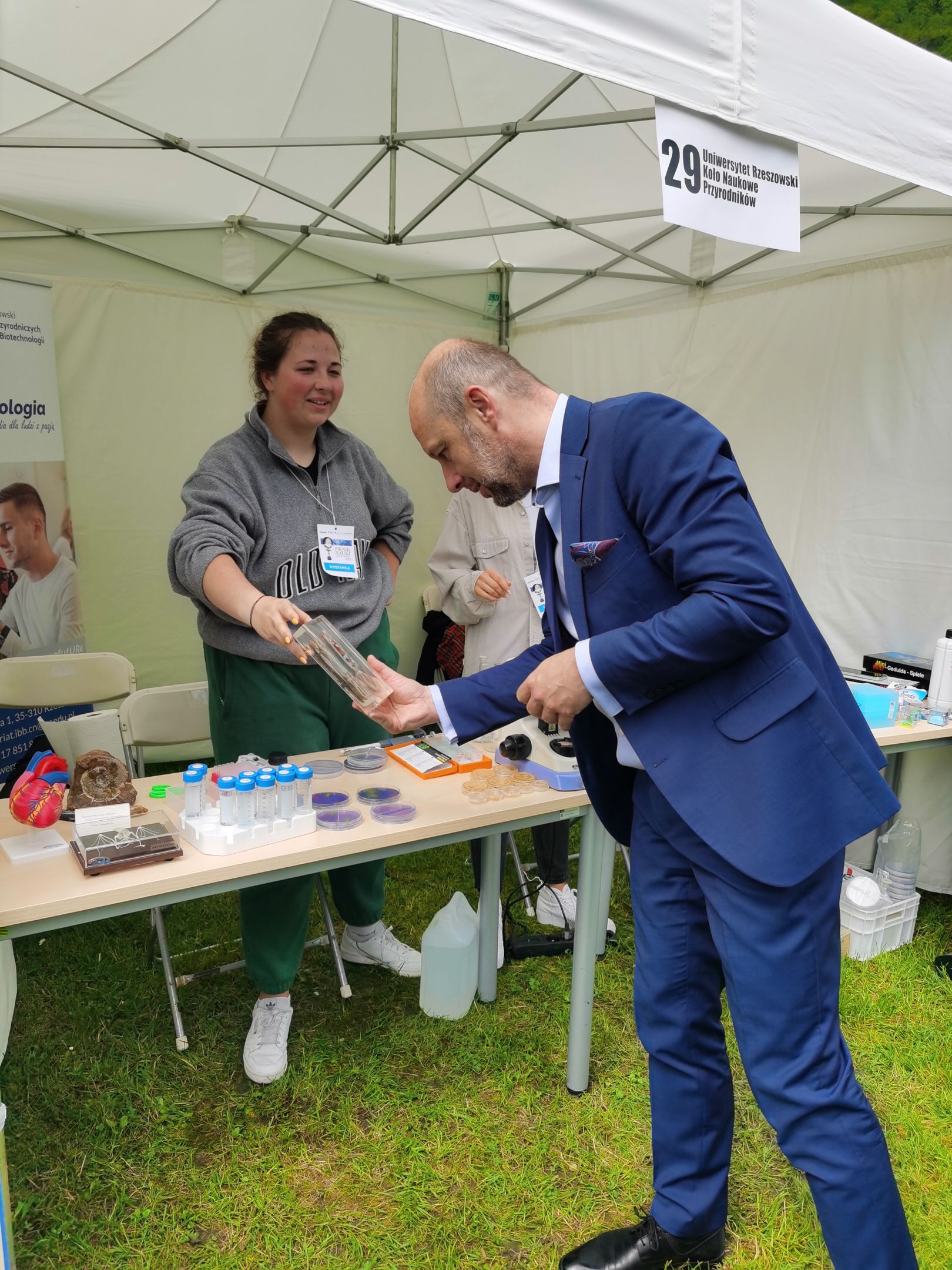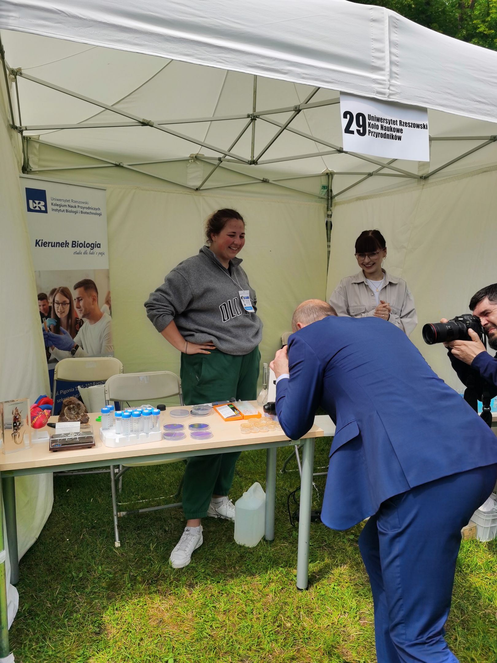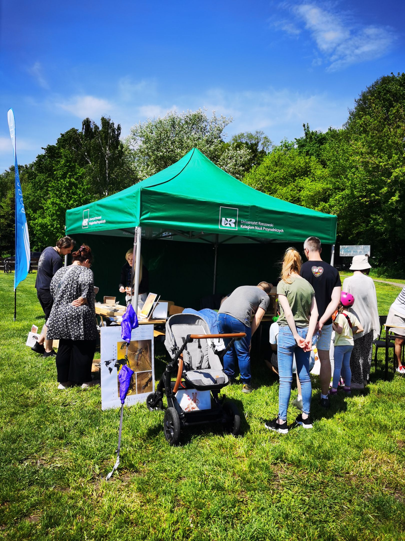 Zwiedzający mieli możliwość oglądnąć ul pokazowy, który dzięki przeźroczystym ścianom służy do demonstracji pracy pszczelej rodziny, porozmawiać na temat pszczół oraz pszczelarstwa z prof. Piechowiczem. Dowiedzieć się jak widzą świat pszczoły z dr inż. Kisałą. Poznać podstawowe metody połowu owadów z wykorzystaniem siatek i czerpaków entomologicznych, obejrzeć okazy pod mikroskopem oraz gabloty ze zbiorami owadów z mgr Materowską. Ponadto uczestnicy oglądali liście rożnych rośliny pod binokularem, obserwowali i opisywali różnice w wyglądzie struktur występujących na liściach rożnych gatunków, mogli również własnoręcznie przygotować preparaty mikroskopowe z liści roślin występujących nad Wisłokiem pod czujnym okiem mgr Kuty. Dzięki prof. Kani-Kłosok i mgr Tuchowskiemu nie zabrakło również świata zwierząt i roślin sprzed milionów lat zatrzymanego w bezruchu. Inkluzje owadów zatopionych w bursztynie bałtyckim i kopalu kolumbijskim pozwoliły na poznanie dokładnej, trójwymiarowej budowy tych organizmów. Oprócz inkluzji na stanowisku znalazły się również różne typy skamieniałości. Uczestnicy mogli obejrzeć budowę i strukturę muszli amonitów, wymarłych głowonogów sprzed 150 mln lat, z czasów gdy po Ziemi stąpały dinozaury. Jednymi z najcenniejszych okazów były liczące aż 500 mln lat skamieniałości trylobitów. Nie zabrakło też odcisków szkieletów różnych gatunków ryb sprzed 25 mln lat, których okazy pozyskano na stanowiskach w okolicach Rzeszowa. Wśród skamieniałości roślinnych znalazły się skamieniały fragmenty pni drzew, a także charakterystyczne odciski kory należącego do widłaków różnozarodnikowych lepidodendronu, liczącego około 235 mln lat.