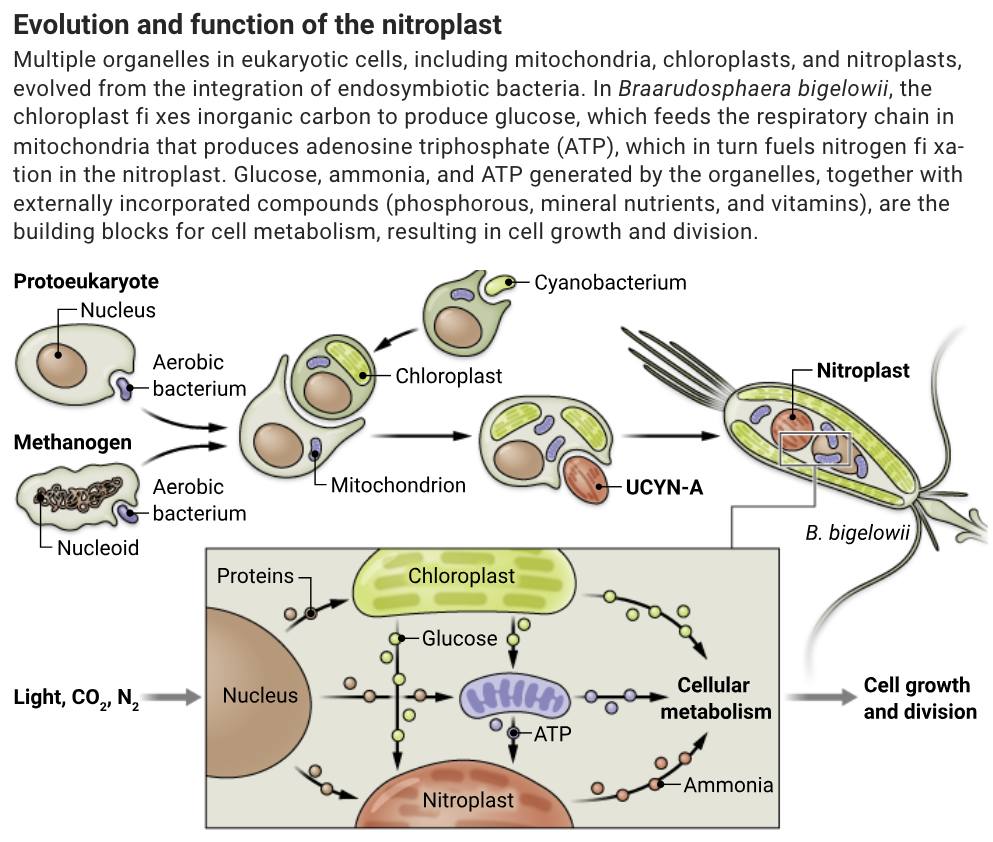 Zespół naukowców z USA, Tajwanu i Japonii opisał pierwszy poznany organizm eukariotyczny zdolny do wiązania azotu atmosferycznego! Jest nim gatunek jednokomórkowych glonów morskich – Braarudosphaera bigelowii – zawierający NITROPLASTY nowy typ organelli zdolnych do asymilacji azotu atmosferycznego do form przyswajalnych biologicznie. Zwykle azot, będący istotnym składnikiem odżywczym, rośliny i glony uzyskują dzięki symbiotycznym związkom z bakteriami. Tak też traktowano sytuację powiązania glonu B. bigelowii z cyjanobakterią zwaną UCYN-A. Jednakże, po dokładnych analizach zespół badaczy dowiódł, że sinica wiążąca azot została wchłonięta przez komórkę-przodka opisywanego gatunku glonu. Wydaje się więc, że mamy do czynienia z nowym przypadkiem pierwotnej endosymbiozy, w której pochłonięty przez komórkę mikroorganizm symbiotyczny stopniowo przekształca się w organellum komórkowe, podobnie jak tłumaczone jest pochodzenie mitochondriów i chloroplastów. Opisane odkrycie rzuca nowe światło na kwestie ewolucyjnego przejścia od endosymbiontu do organelli.