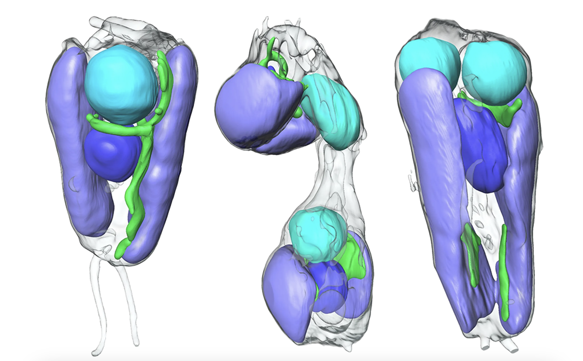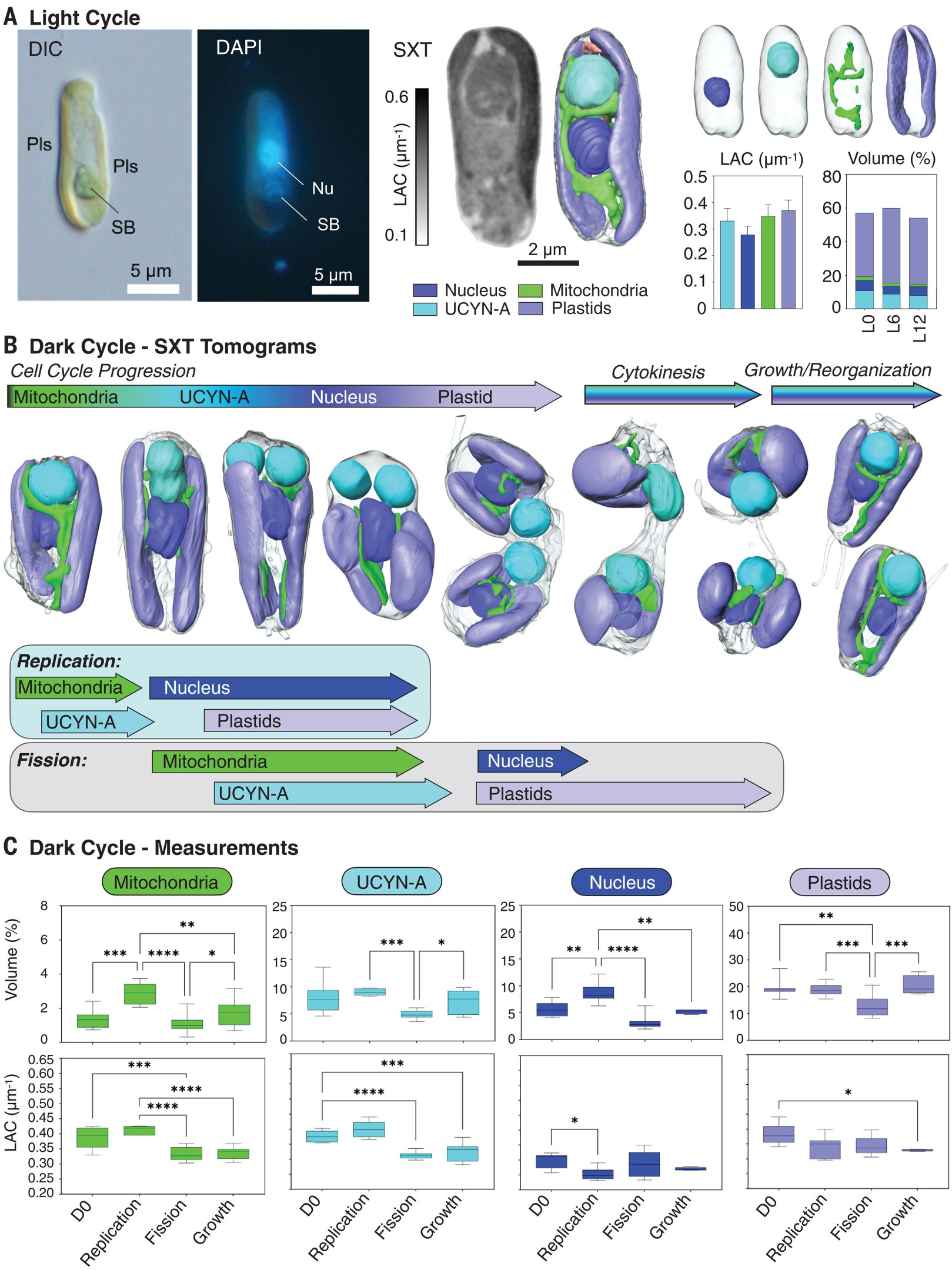 Zdjęcia, wygenerowane za pomocą tomografii rentgenowskiej przez naukowców z Berkeley Lab, obrazujące glony na różnych etapach podziału komórek. UCYN-A, jednostka wiążąca azot, obecnie uważana za organellum zaznaczone kolorem cyjanowym; jądro glonów jest przedstawione na niebiesko, mitochondria są zielone, a chloroplasty są liliowe.