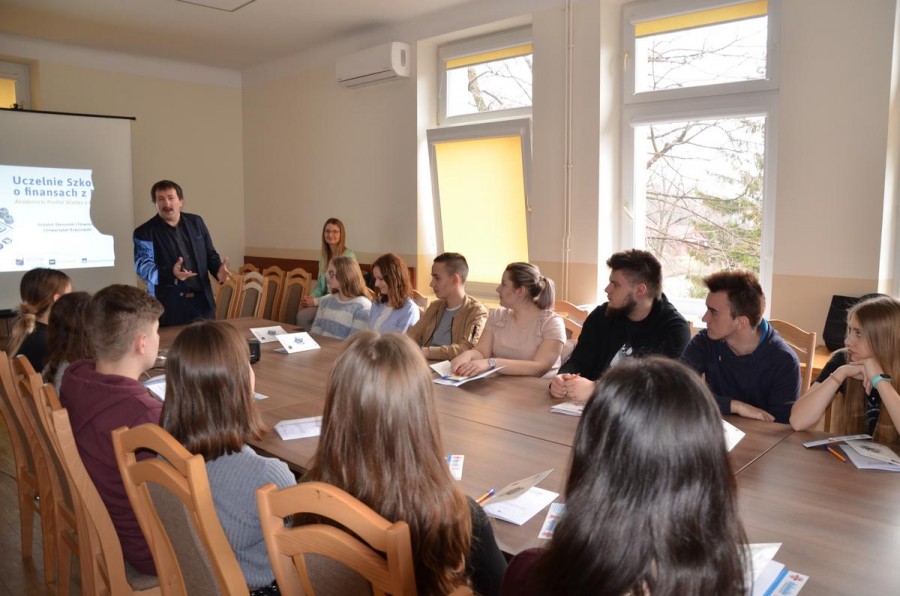 W ramach realizacji projektu „Uczelnie Szkołom – o finansach z NBP. Akademicki Portfel Wiedzy o Finansach” pracownicy Instytutu Ekonomii i Finansów w dniu 27 lutego 2020 roku odwiedzili Zespół Szkół w Łańcucie. Zespół w składzie: dr Magdalena Cyrek, mgr Magdalena Wiercioch, dr Piotr Cyrek przeprowadził zajęcia warsztatowe dla uczniów zainteresowanych pogłębianiem swojej wiedzy ekonomicznej. Młodzież aktywnie uczestniczyła w dyskusji na temat planowania kariery zawodowej, rozwiązywała zadania dotyczące form obrotu pieniężnego oraz poznawała tajniki funkcjonowania instytucji stabilizujących gospodarkę, a także z zaangażowaniem rywalizowała o miejsca w finale „Konkursu wiedzy o finansach”.