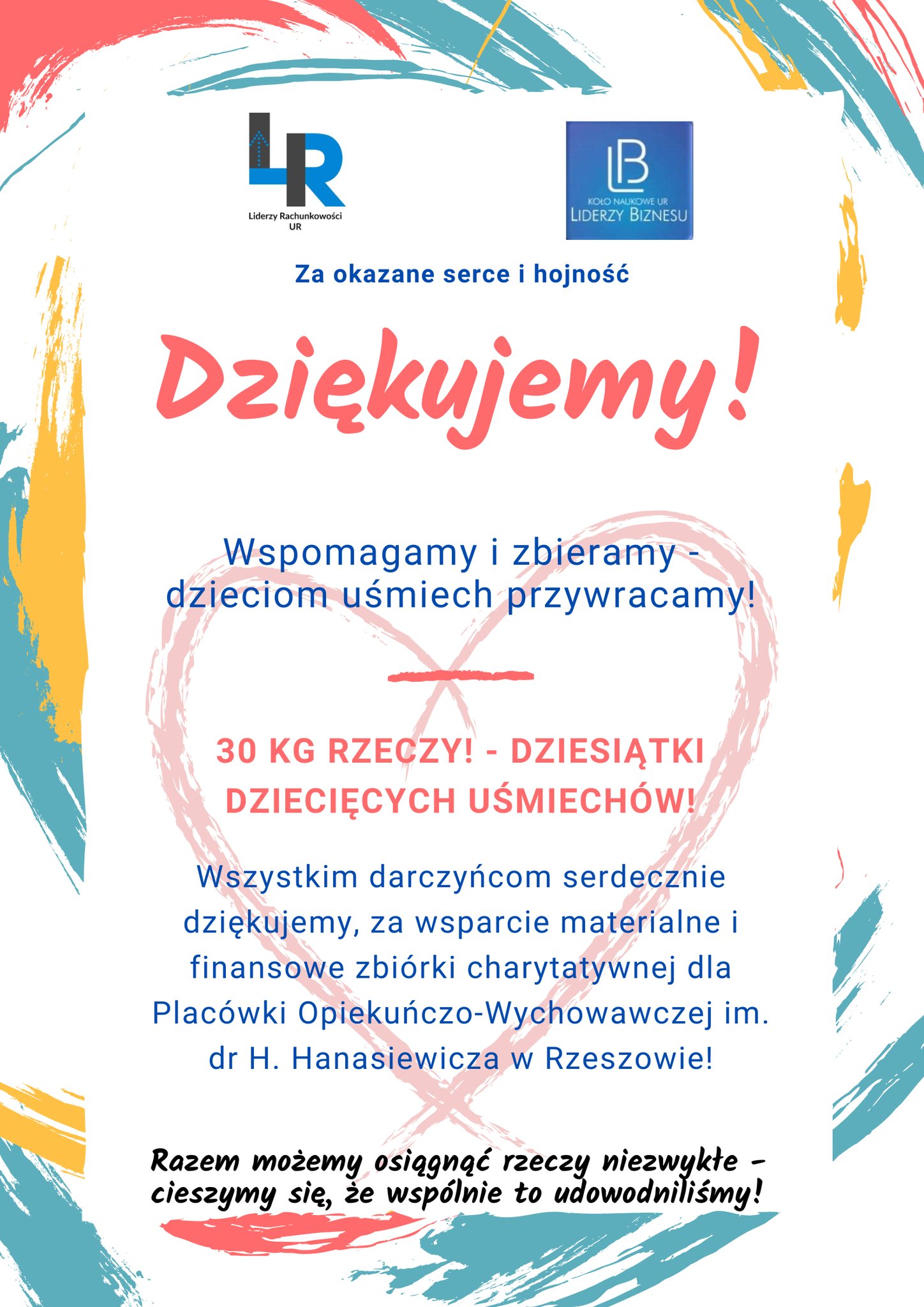 Sekcja Rachunkowości, działająca w ramach Koła Naukowego „Liderzy Biznesu” funkcjonującego przy Instytucie Ekonomii i Finansów, zorganizowała zbiórkę charytatywną o nazwie „Paczka Radości”. Trwała ona od 15.12.2022 r. do 13.01.2023 r. Motywem przewodnim akcji było hasło: „Wspomagamy i zbieramy - dzieciom uśmiech przywracamy”, a jej celem była rzeczowa zbiórka dla domu dziecka – Placówka Opiekuńczo-Wychowawcza im. dr Henryka Hanasiewicza w Rzeszowie.