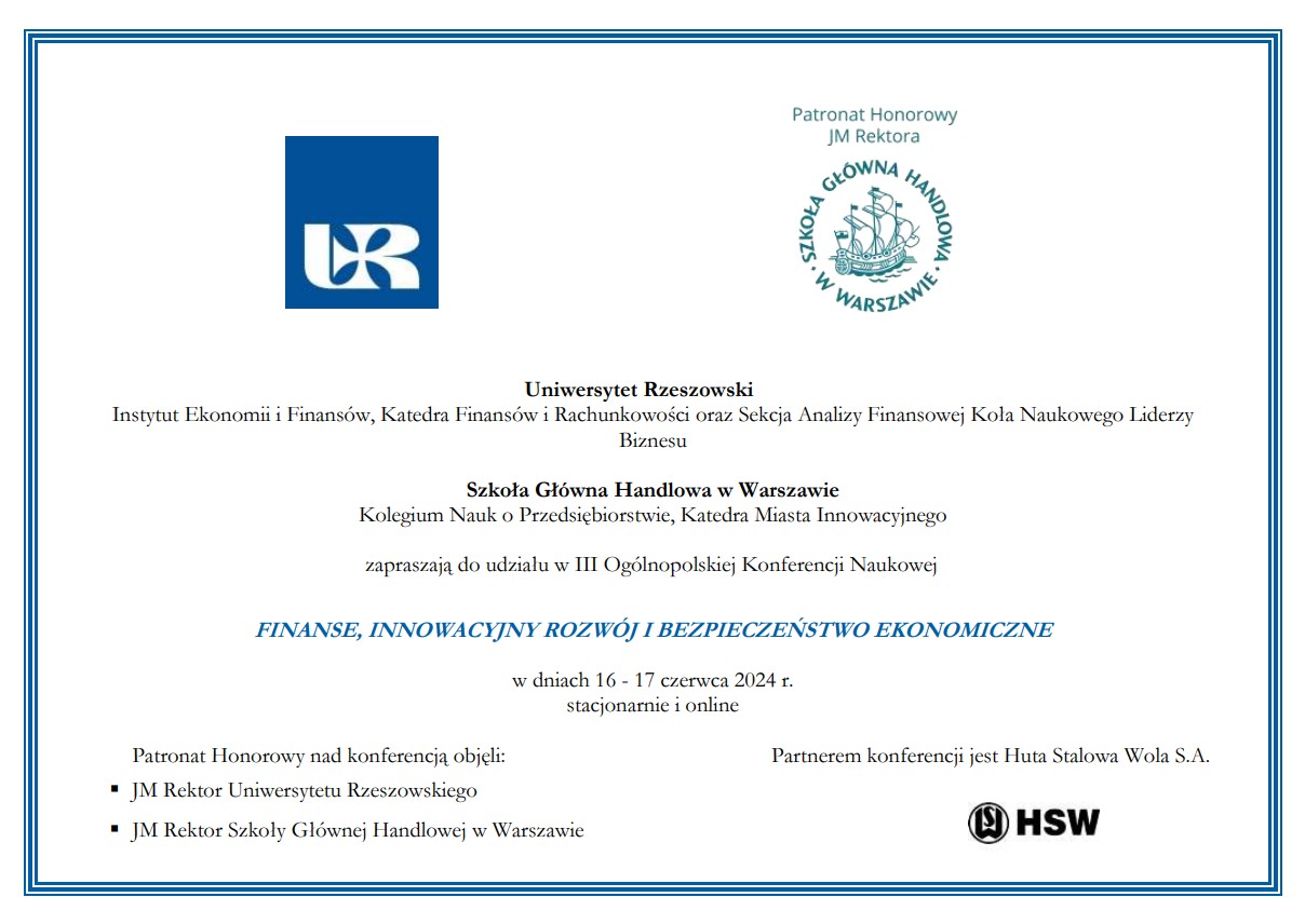 III Ogólnopolska Konferencja Naukowa FINANSE, INNOWACYJNY ROZWÓJ I BEZPIECZEŃSTWO EKONOMICZNE 16-17.06.2024 r.