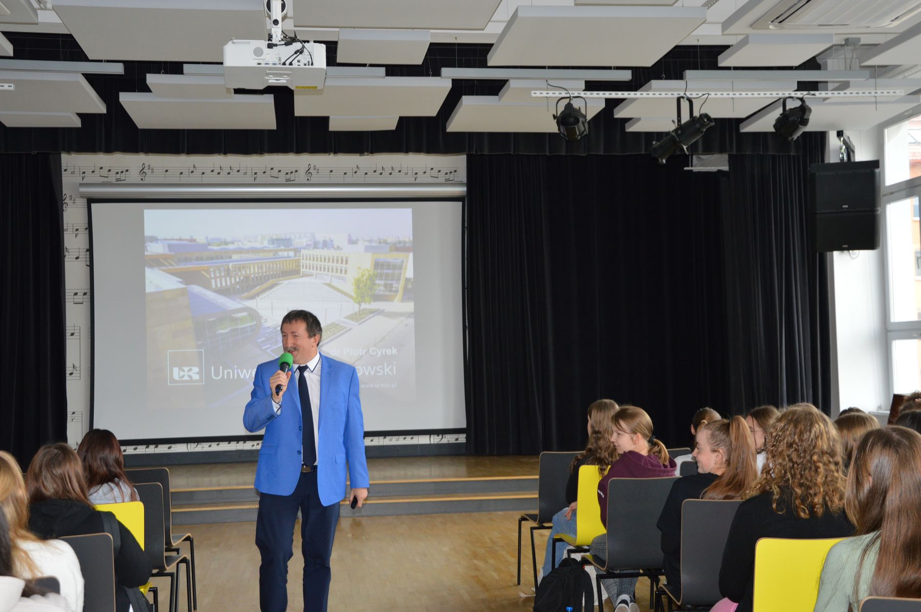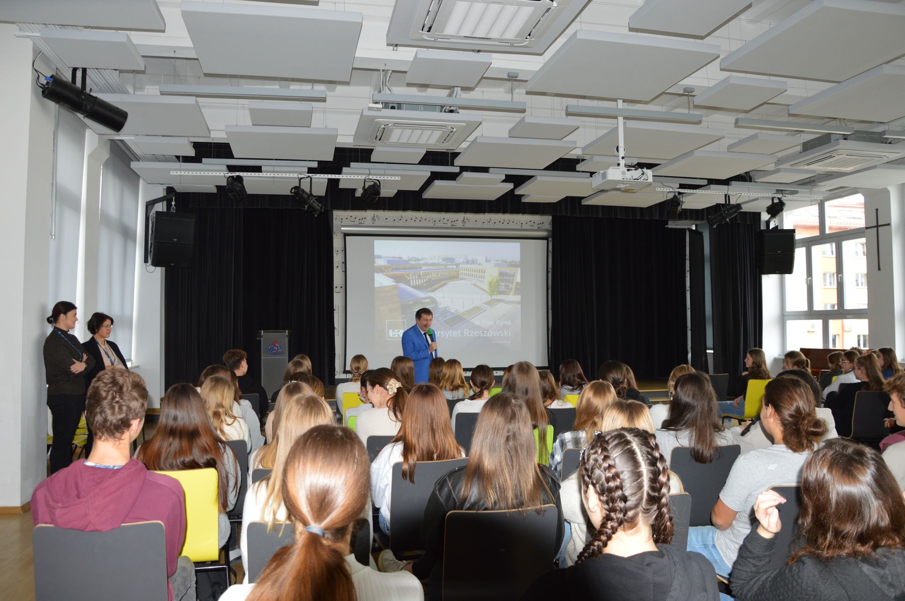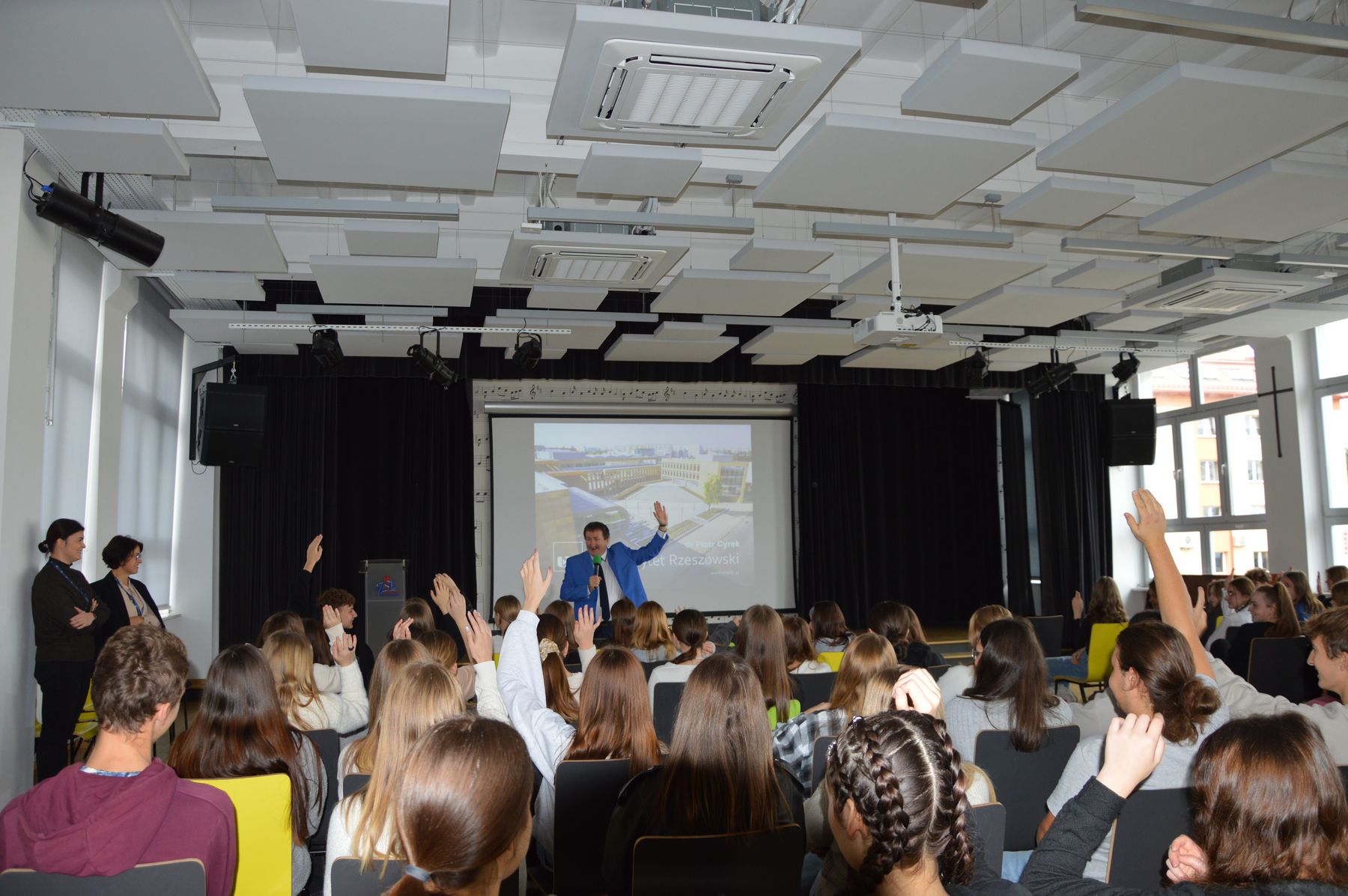 Głównym założeniem umowy jest współpraca badawczo-dydaktyczna między społecznością akademicką Uczelni, a w szczególności Instytutu Ekonomii i Finansów Kolegium Nauk Społecznych UR a społecznością Szkoły i rozwijanie, pod patronatem Uniwersytetu Rzeszowskiego, uzdolnień uczniów. W tym kontekście dr Piotr Cyrek przeprowadził dla blisko 100 uczniów wykład z elementami dyskusji, motywujący młodzież do podjęcia wzmożonego wysiłku dla zdobywania wiedzy już na etapie początku szkoły średniej. Głównym wątkiem prowadzonej dyskusji była automotywacja do nauki, bez której trudno w przyszłości osiągać satysfakcjonujący poziom realizacji aspiracji zawodowych czy majątkowych. Istotnym elementem spotkania z uczniami były rozważania na temat konieczności konstruowania planów edukacji i kariery możliwie wcześnie, dzięki czemu można precyzyjnie określać cele, a następnie konsekwentnie je realizować, poszukując właściwych środków i narzędzi.