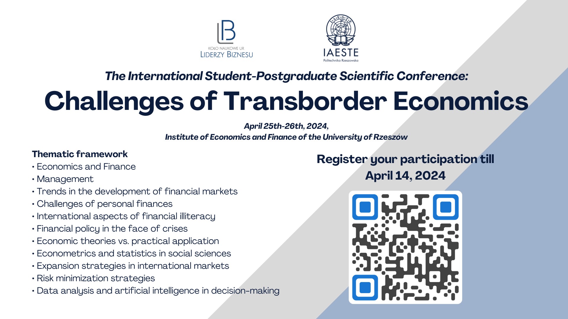 W imieniu Koła Naukowego UR Liderzy Biznesu, działającego przy Instytucie Ekonomii i Finansów UR oraz Stowarzyszenia IAESTE Politechnika Rzeszowska, chciałbym serdecznie zaprosić do uczestnictwa w Międzynarodowej Studencko - Doktoranckiej Konferencji Naukowej „Challenges of Transborder Economics”.