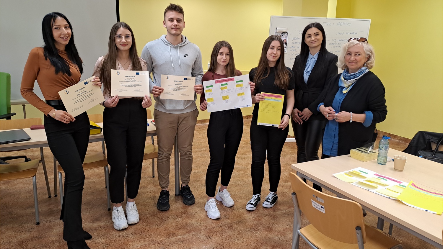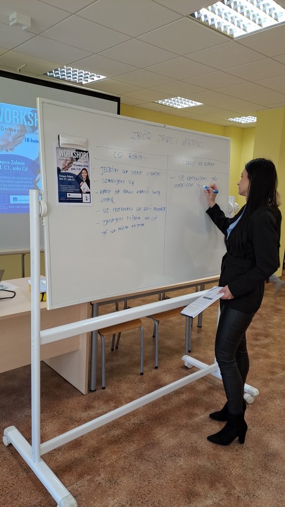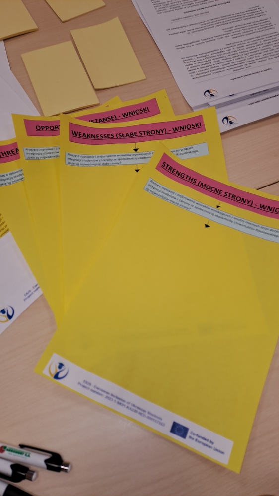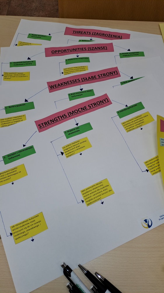 Uczestnicy warsztatów dokonali przeglądu, a następnie analizy najważniejszych aspektów związanych z inkluzją studentów napływających z Ukrainy. Spotkanie rozpoczęło się od ice breaker’ów, które przyczyniły się do wypracowania swobodnej atmosfery oraz integracji studentów. Wykorzystano różne metody i instrumenty pracy warsztatowej, m. in. analizę SWOT. Poszczególne zespoły zidentyfikowały czynniki, które decydują o mocnych i słabych stronach procesu umiędzynarodawiania i integracji studentów różnych narodowości. Uczestnicy warsztatów wskazali również najważniejsze szanse oraz zagrożenia, jakie wiążą się z napływem studentów z zagranicy. Na zakończenie spotkania grupy zaprezentowały wypracowane wnioski. Każdy student otrzymał certyfikat potwierdzający udział w warsztatach.