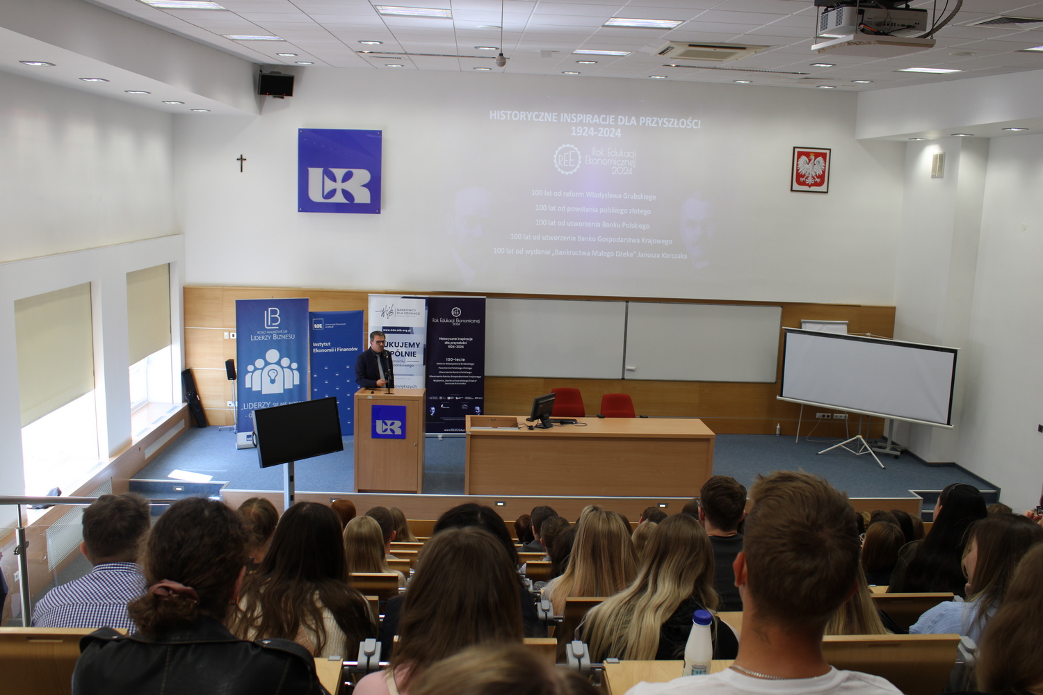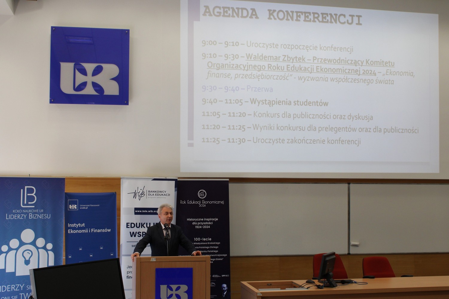 Mieliśmy również zaszczyt wysłuchać Przewodniczącego Komitetu Organizacyjnego Roku Edukacji Ekonomicznej 2024, Pana Waldemara Zbytka. W trakcie swojego wystąpienia zatytułowanego „Ekonomia, finanse, przedsiębiorczość - wyzwania współczesnego świata” opowiedział o największych problemach współczesnego świata, a także przedstawił ideę Roku Edukacji Ekonomicznej 2024.