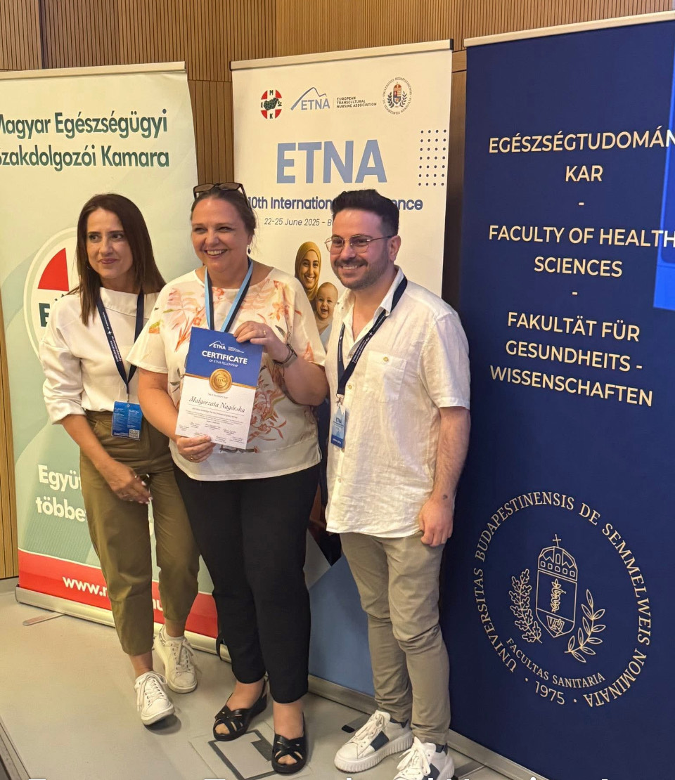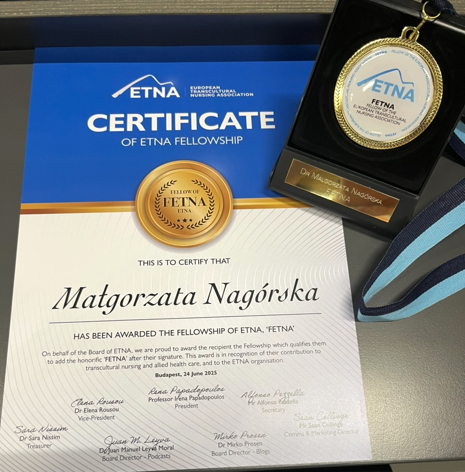 Podczas 15. międzynarodowej konferencji European Transcultural Nursing Association (ETNA), 22-25 czerwca 2025 w Budapeszcie dr hab. Małgorzata Nagórska otrzymała prestiżowe międzynarodowe wyróżnienie – tytuł Fellow of the European Transcultural Nursing Association (FETNA) - przyznawane przez międzynarodową kapitułę ETNA w dowodzie uznania za znaczący dorobek naukowy w obszarze opieki transkulturowej oraz promowanie kompetencji kulturowych w opiece zdrowotnej.