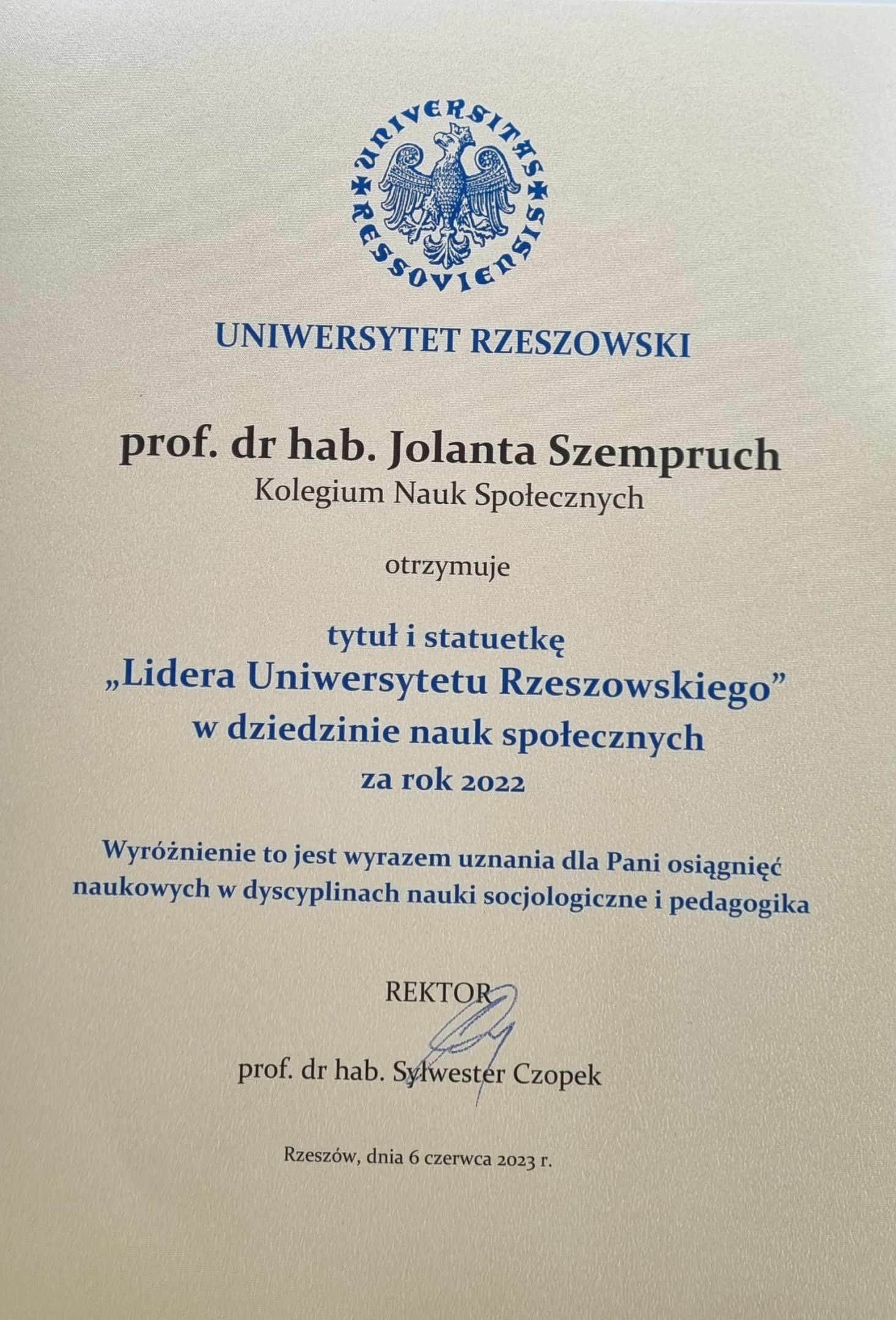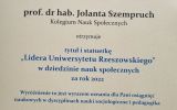 prof. dr hab. Jolanta Szempruch otrzymała tytuł oraz statuetkę "Lidera Uniwersytetu Rzeszowskiego" w dziedzinie nauk społecznych za rok 2022