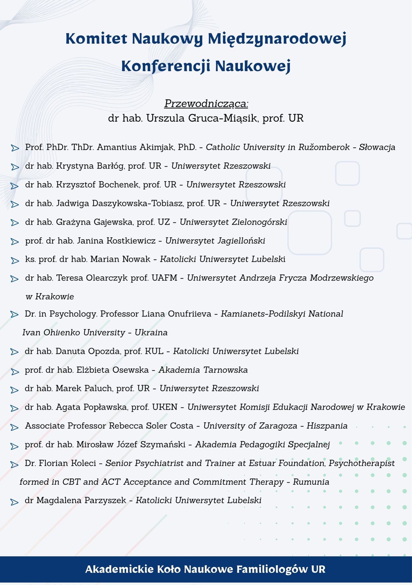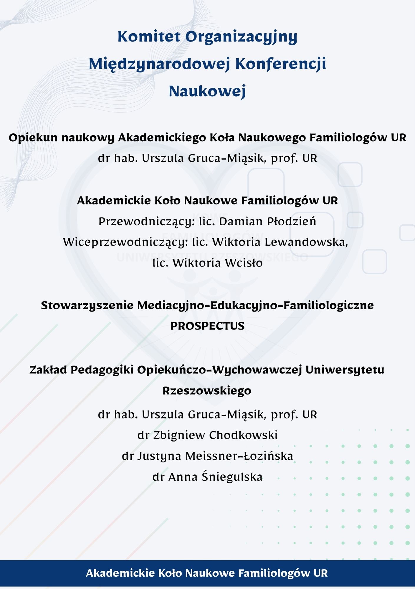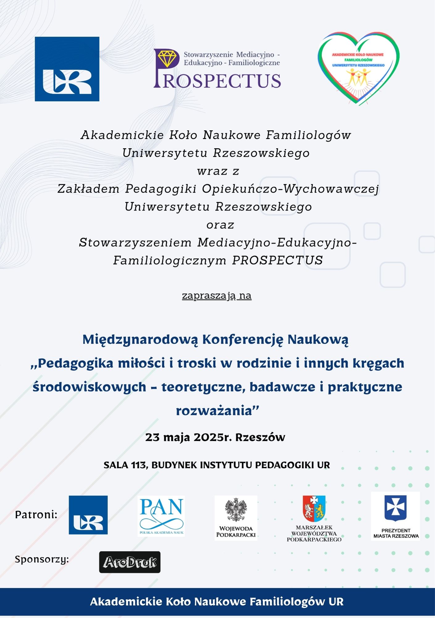 Za nami kolejna edycja konferencji poświęconej tematyce rodziny. Konferencja została zorganizowana przez Akademickie Koło Familiologów UR, Stowarzyszenie Mediacyjno-Edukacyjno-Familiologiczne PROSPECTUS oraz Zakład Pedagogiki Opiekuńczo-Wychowawczej UR. Miała miejsce 23 maja 2025 w budynku Instytutu Pedagogiki UR w sali 113. Konferencja rozpoczęła się o godz 9:00 od przywitania gości przez dr hab. Prof. UR Urszulę Grucę-Miąsik - opiekunkę Koła, dyrektora Instytutu Pedagogiki dr hab. Prof. UR Jadwigę Daszykowską-Tobiasz oraz Panią prof. Elżbietę Osewską z Akademii Tarnowskiej, którą mieliśmy przyjemność gościć na naszej konferencji i posłuchać jej znakomitego wystąpienia oraz przez przewodniczącego Koła Familiologów lic. Damiana Płodzień.