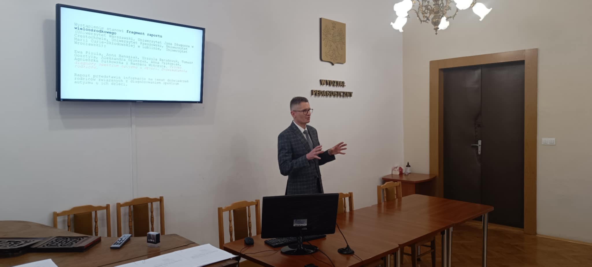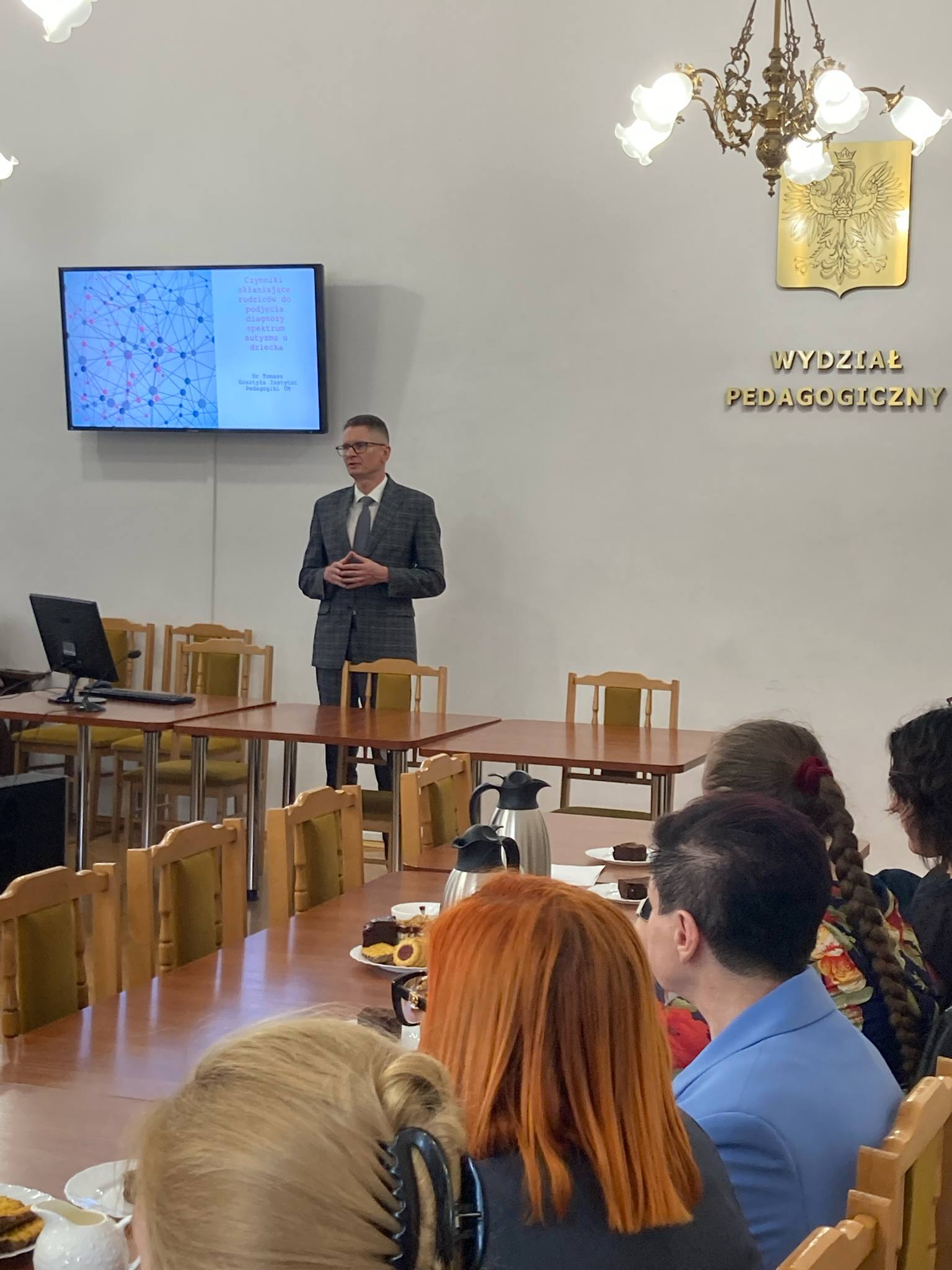 Ważny punkt spotkania stanowił wykład dra Tomasza Gosztyły zatytułowany: „Czynniki skłaniające rodziców do podjęcia diagnozy spektrum autyzmu u dziecka”, który zainicjował merytoryczną dyskusję na temat aktualnych wyzwań w obszarze wsparcia rodzin dzieci ze spektrum autyzmu.