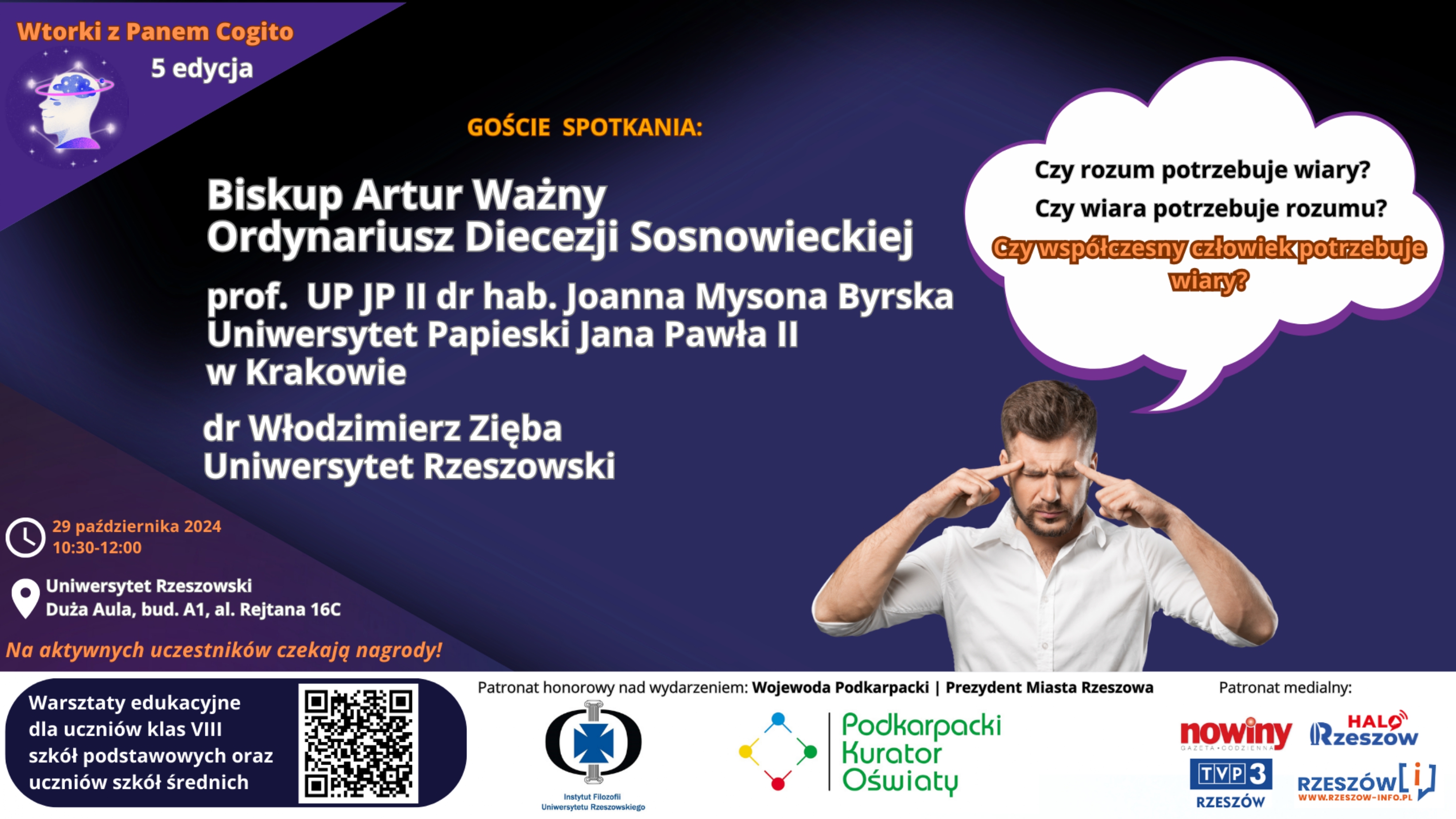 Instytut Filozofii Uniwersytetu Rzeszowskiego ma zaszczyt zaprosić na kolejne wydarzenie z serii „Wtorki z Panem Cogito”, które realizowane jest od listopada 2022 roku. Pan Cogito, bohater wierszy Zbigniewa Herberta, przypomina nam, że tylko człowiek myślący może prowadzić sprawiedliwe i odważne życie.