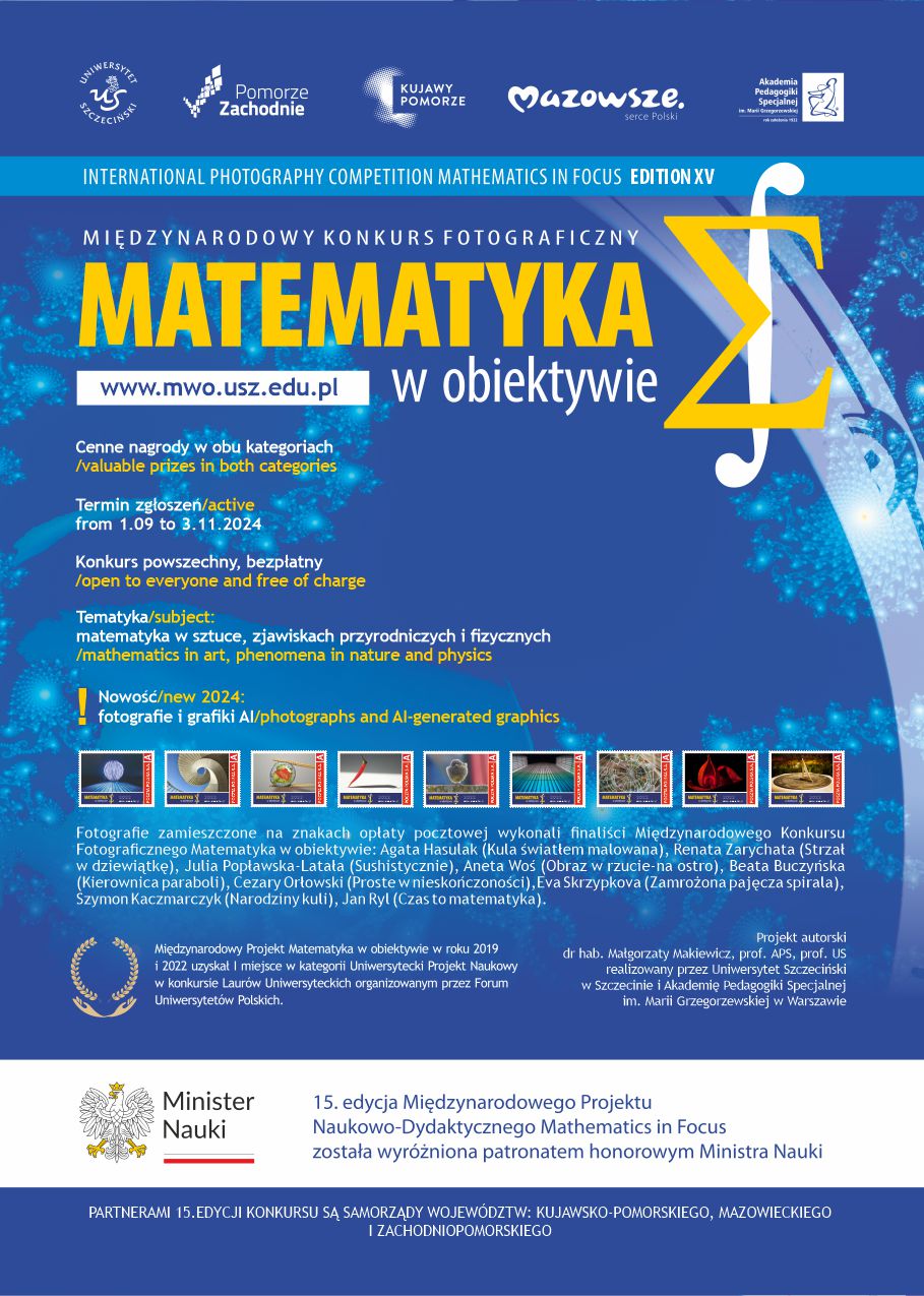 W imieniu Pani Prof. APS, dr hab. Małgorzaty Makiewicz, Kierownika Projektu Mathematics in Focus zapraszam do udziału i promowania XV edycji konkursu „Matematyka w obiektywie”, która została wyróżniona patronatem Ministra Nauki.