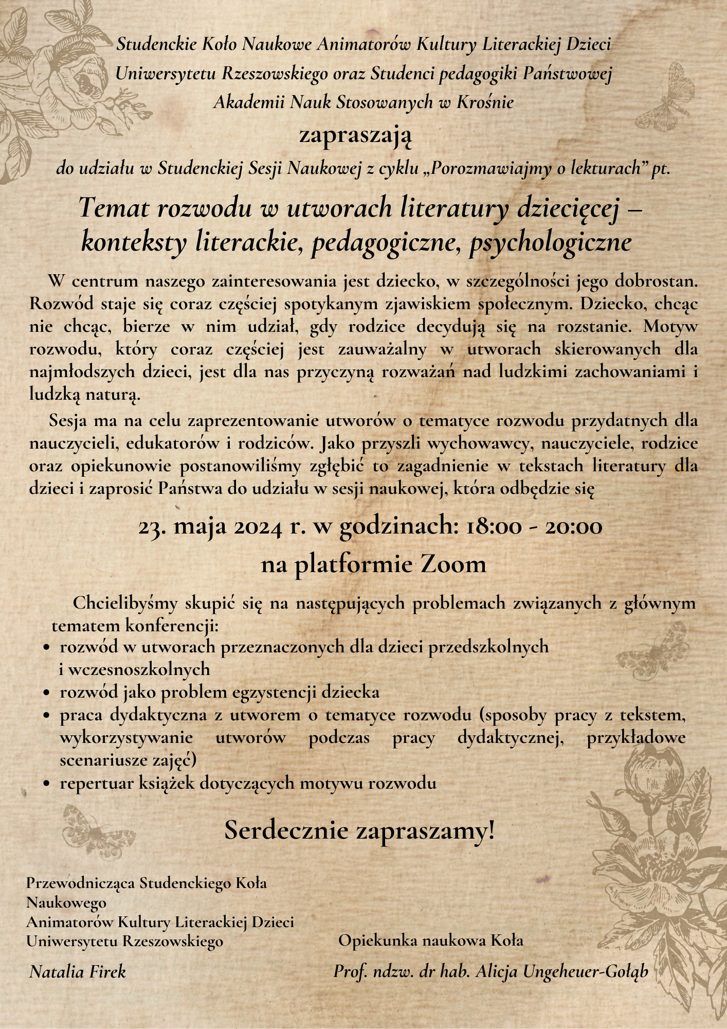 Temat: Studencka Sesja Naukowa z cyklu: Porozmawiajmy o lekturach – Tabu w literaturze dziecięcej pt. Temat rozwodu w utworach literatury dziecięcej – konteksty literackie, psychologiczne, pedagogiczne