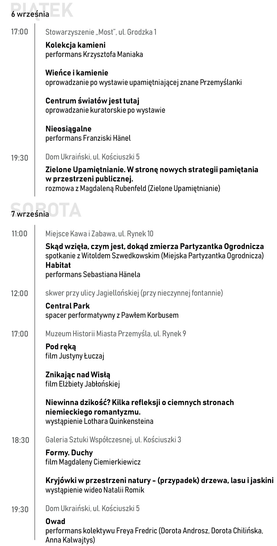Na program składają się interwencje (wideo, instalacje, fotografie) w oknach i witrynach, a także w lokalach udostępnionych nam przez Urząd Miejski w Przemyślu, prezentowane podczas oprowadzania kuratorskiego, a także komponent teoretyczny: wystąpienia, które będą traktować interesujące nas zagadnienia z pozycji naukowych i aktywistycznych.