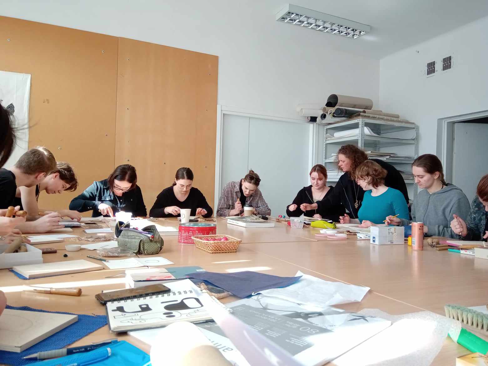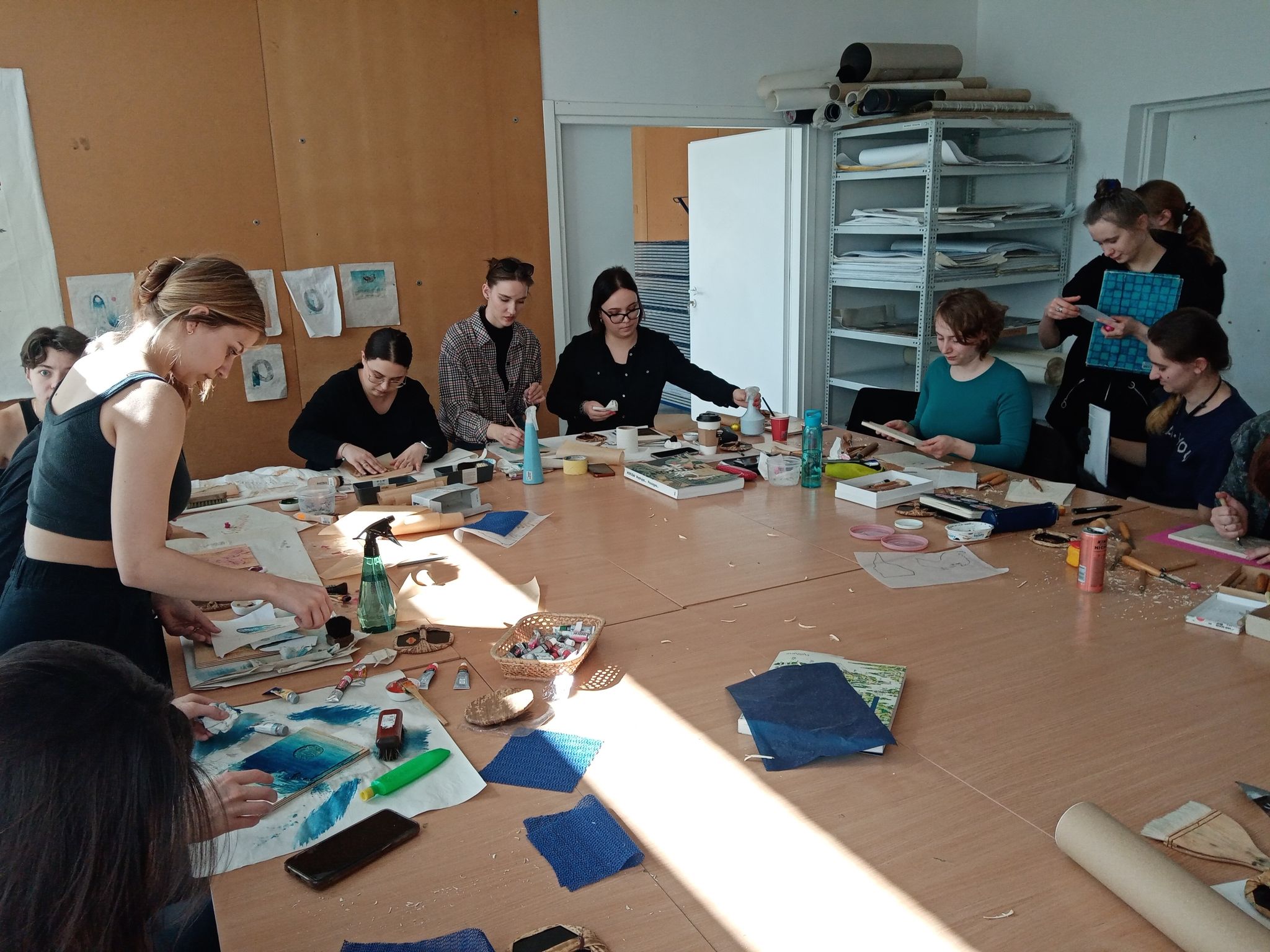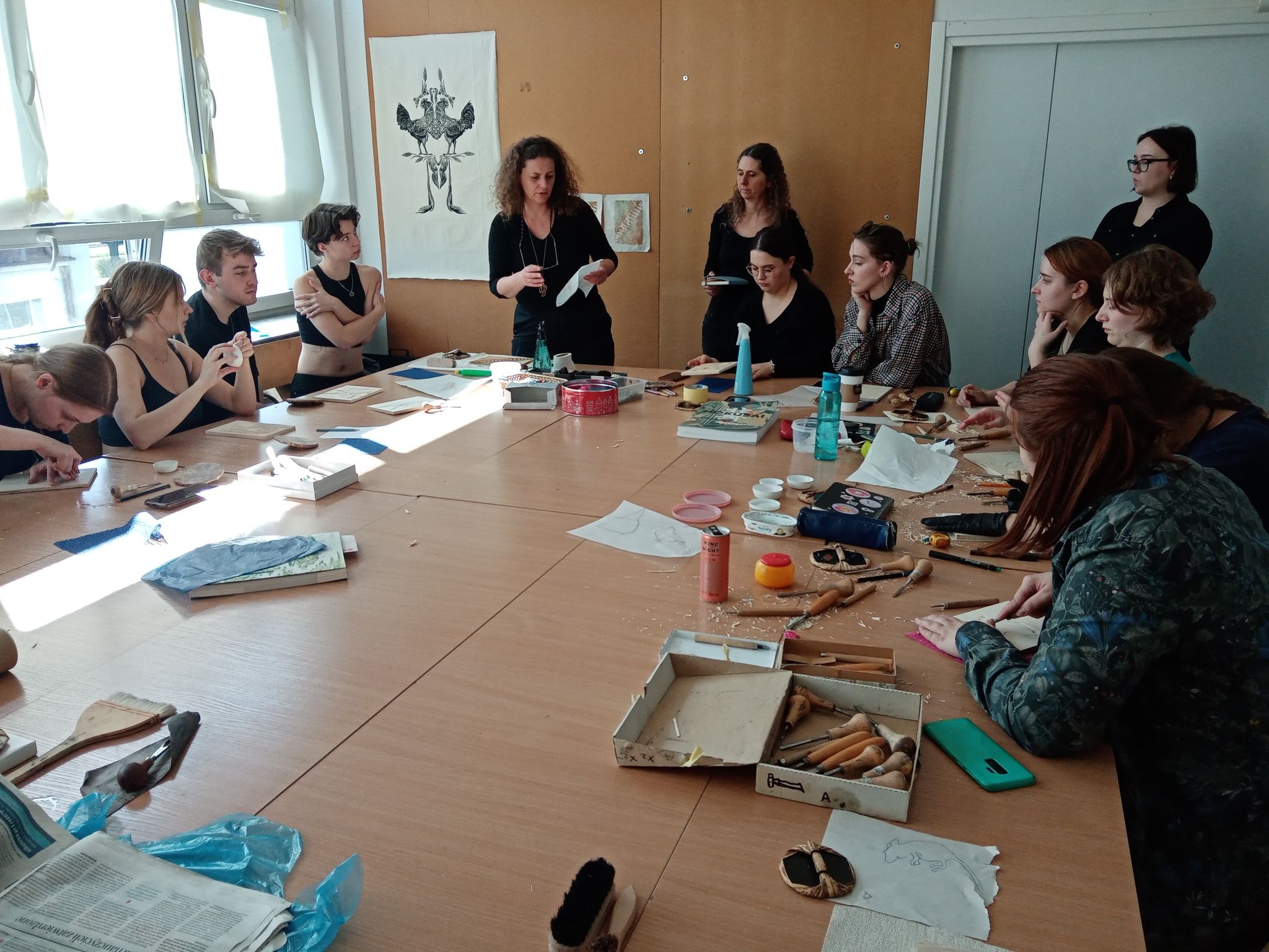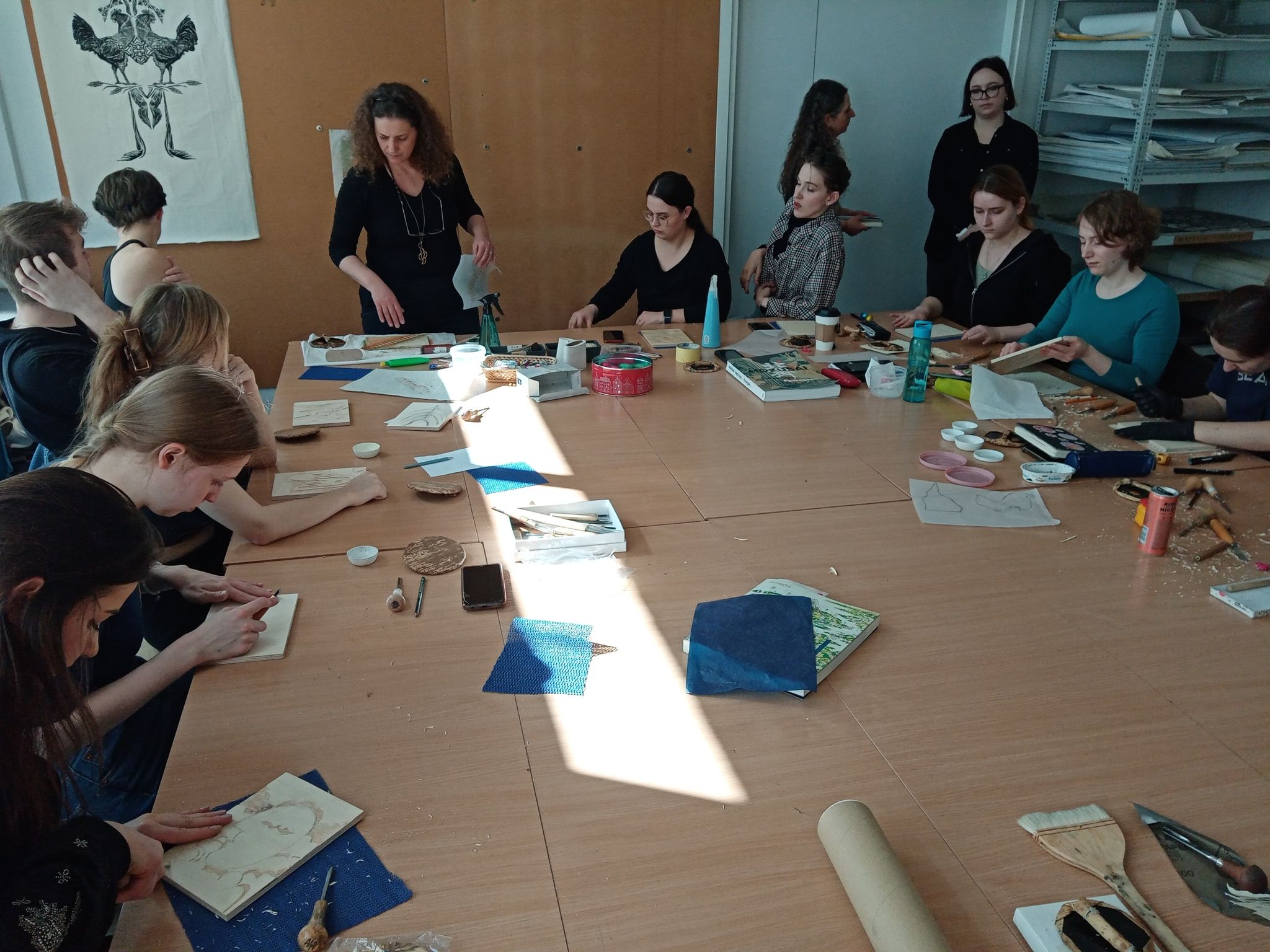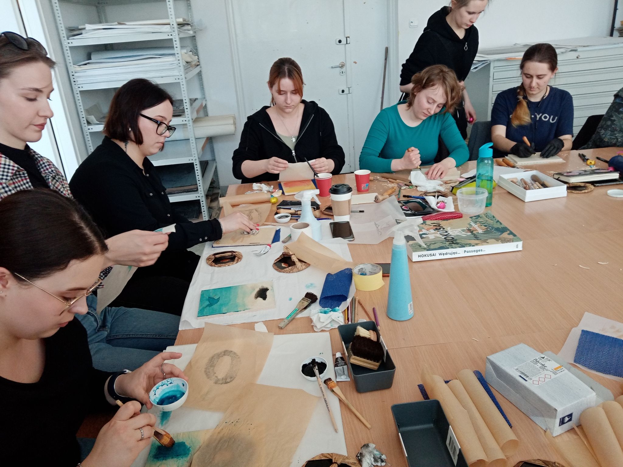 W dniu 27 marca 2024 roku gościliśmy panią dr Martę Bożyk z Wydziału Grafiki Akademii Sztuk Pięknych w Krakowie, która przyjechała do Instytutu Sztuk Pięknych UR, aby w pracowni grafiki warsztatowej druku wypukłego poprowadzić warsztaty graficzne w tradycyjnej japońskiej technice drzeworytu – mokuhanga. Spotkanie rozpoczęło się od wykładu o historii papieru japońskiego washi przez mistrzów ukiyo-e, narzędziach tradycyjnych do drzeworytu, współczesnych artystów pracujących w tej technice. Następnie nasi studenci uczestniczyli w warsztatach graficznych podczas których wykonywali swoje pierwsze kolorowe drzeworyty.