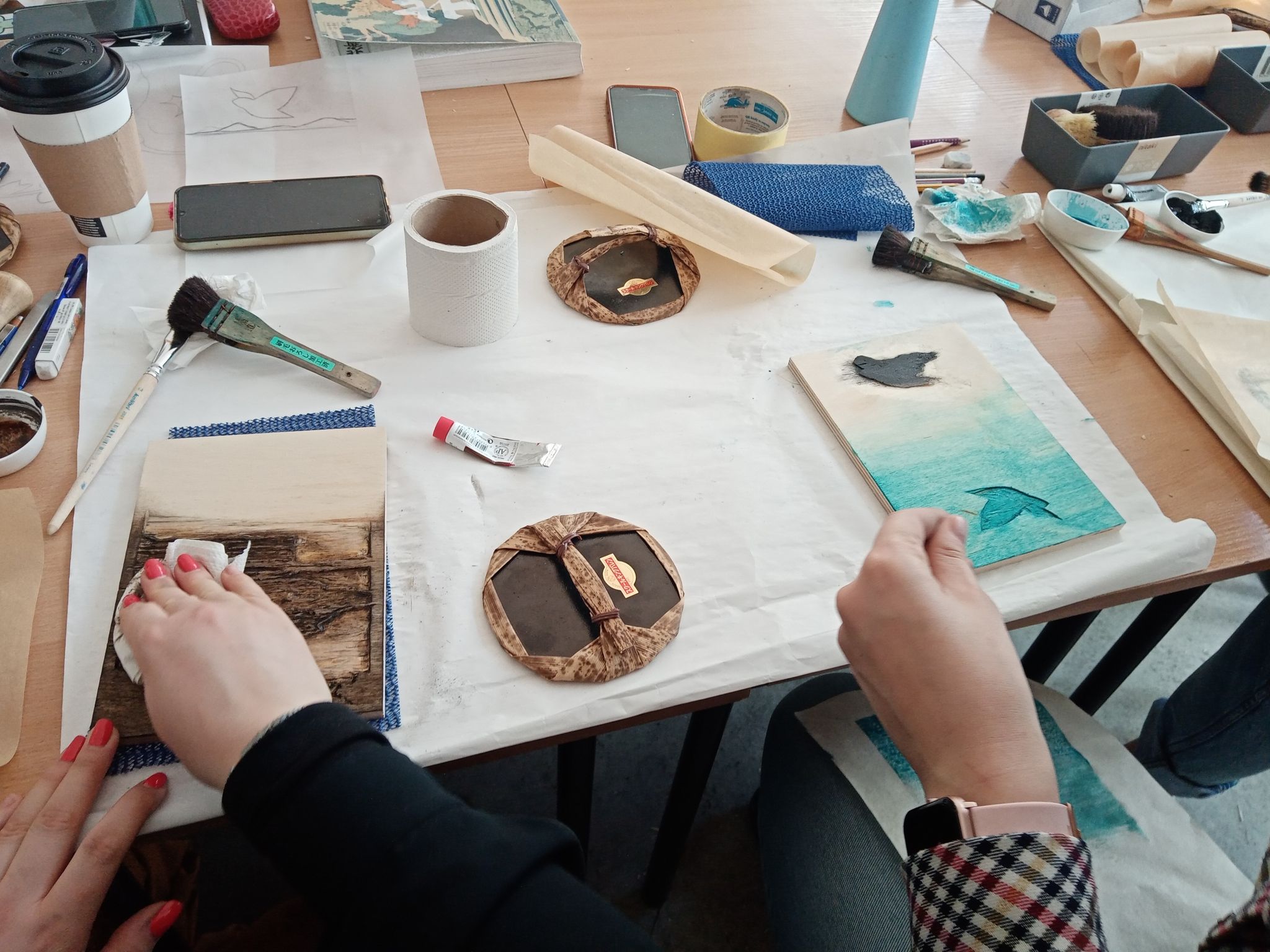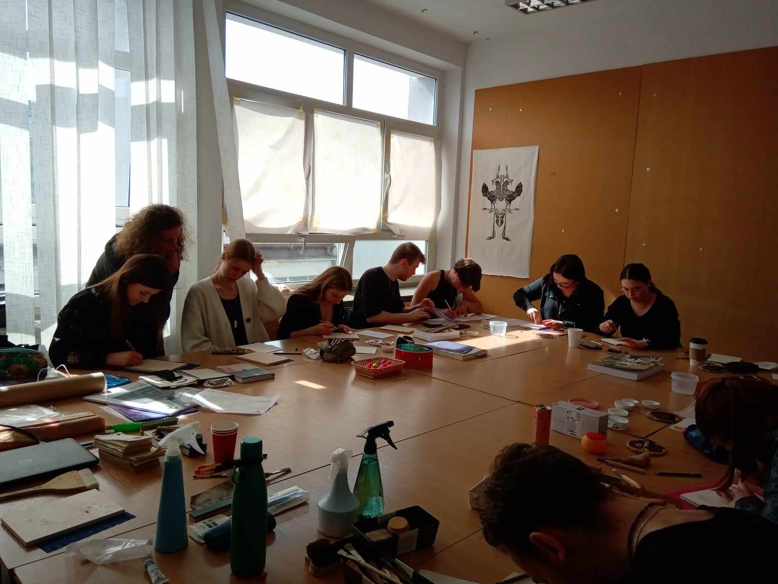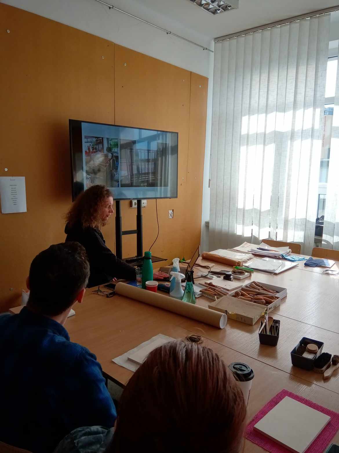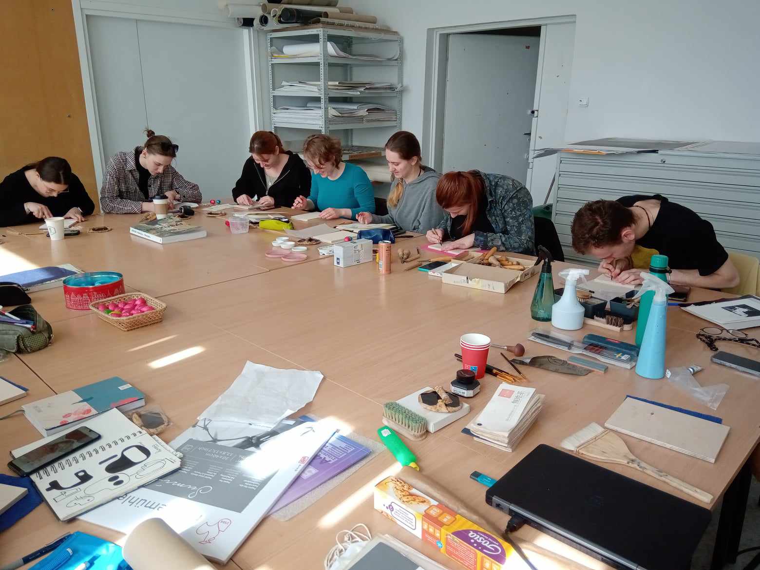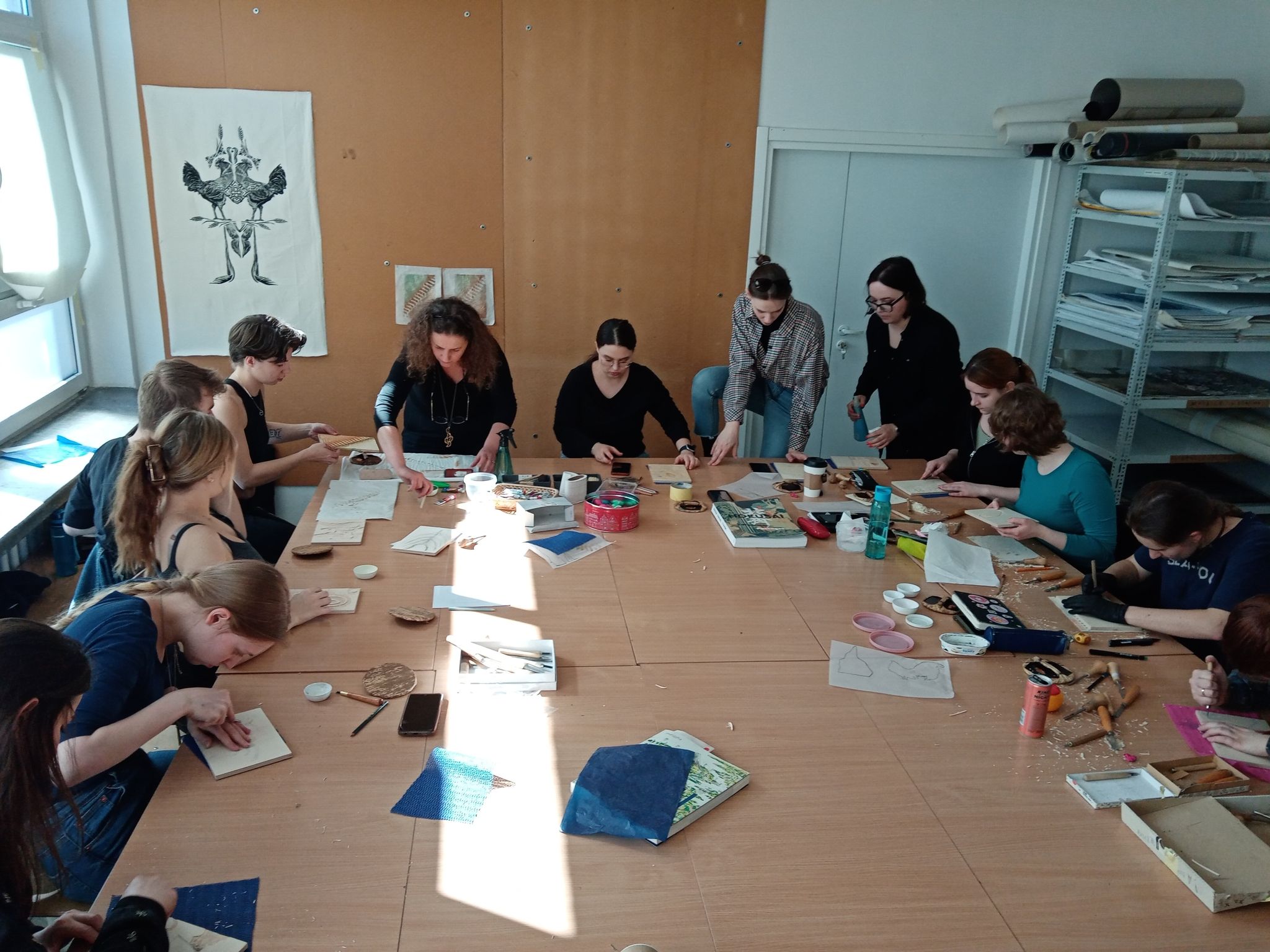 W dniu 27 marca 2024 roku gościliśmy panią dr Martę Bożyk z Wydziału Grafiki Akademii Sztuk Pięknych w Krakowie, która przyjechała do Instytutu Sztuk Pięknych UR, aby w pracowni grafiki warsztatowej druku wypukłego poprowadzić warsztaty graficzne w tradycyjnej japońskiej technice drzeworytu – mokuhanga. Spotkanie rozpoczęło się od wykładu o historii papieru japońskiego washi przez mistrzów ukiyo-e, narzędziach tradycyjnych do drzeworytu, współczesnych artystów pracujących w tej technice. Następnie nasi studenci uczestniczyli w warsztatach graficznych podczas których wykonywali swoje pierwsze kolorowe drzeworyty.