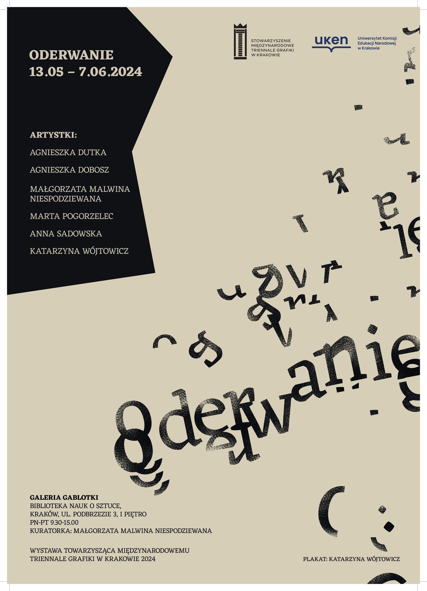 Oderwanie (z łac. abstractio) ‒ wystawa towarzysząca Międzynarodowemu Triennale Grafiki 2024 w Krakowie ‒dotyczy szeroko pojętej interpretacji abstrakcji stosowanej w praktyce artystycznej. Jest to kolejne wydarzenie z cyklu Graficzki prezentujące artystyczno-badawcze ścieżki podejmowane przez kobiety-artystki w grafice warsztatowej.