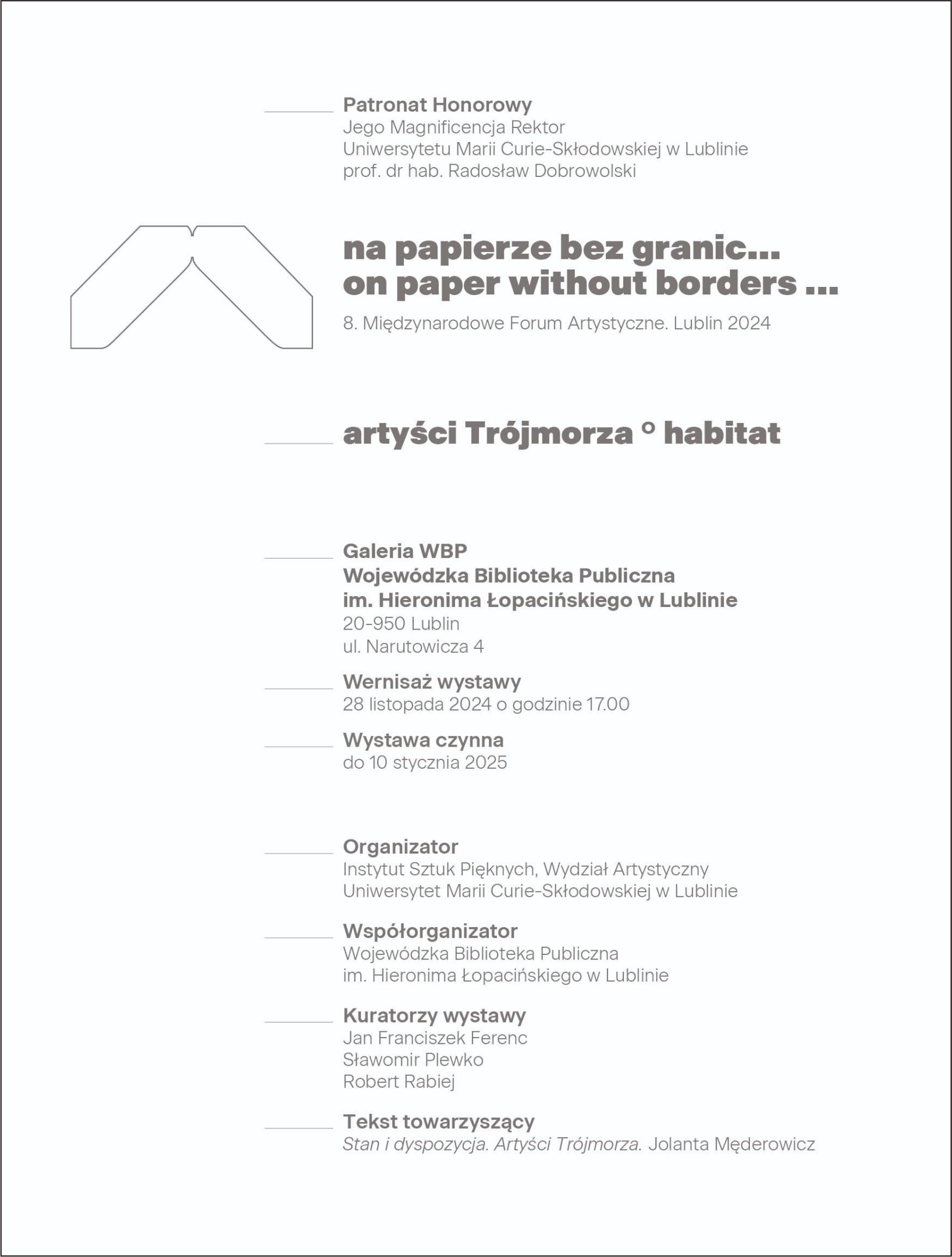 Zapraszamy na wystawę “Na papierze bez granic... 8. Międzynarodowe Forum Artystyczne - Lublin 2024, Artyści Trójmorza - habitat” w której udział biorą dr hab. Agnieszka Jankowska, prof. UR, dr Magdalena Cywicka oraz dr hab. Marek Olszyński, prof. UR