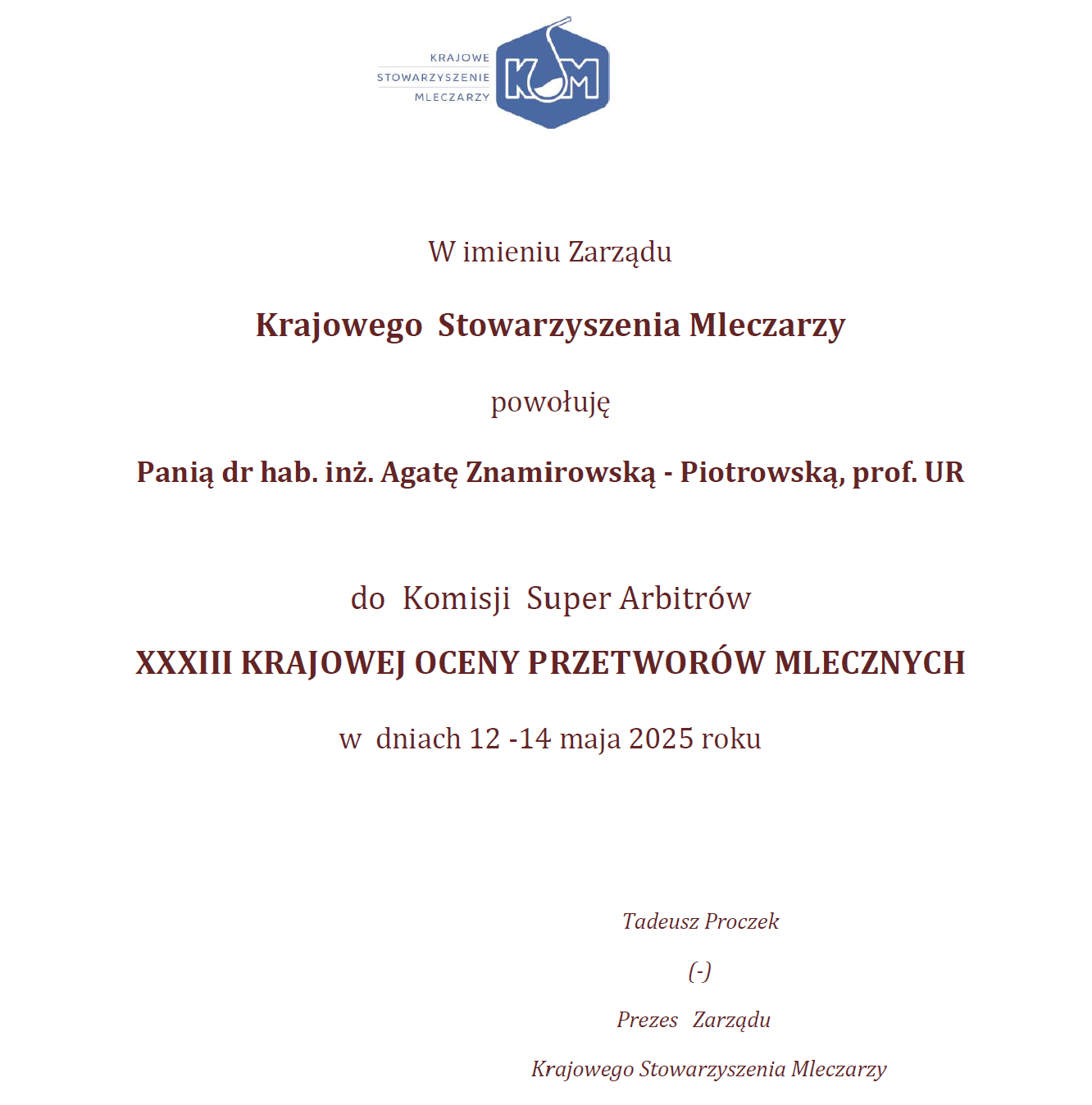 dr hab. inż. Agata Znamirowska-Piotrowska, prof. UR z Wydziału Technologiczno-Przyrodniczego została powołana do Komisji Super Arbitrów XXXIII Krajowej Oceny Przetworów Mlecznych