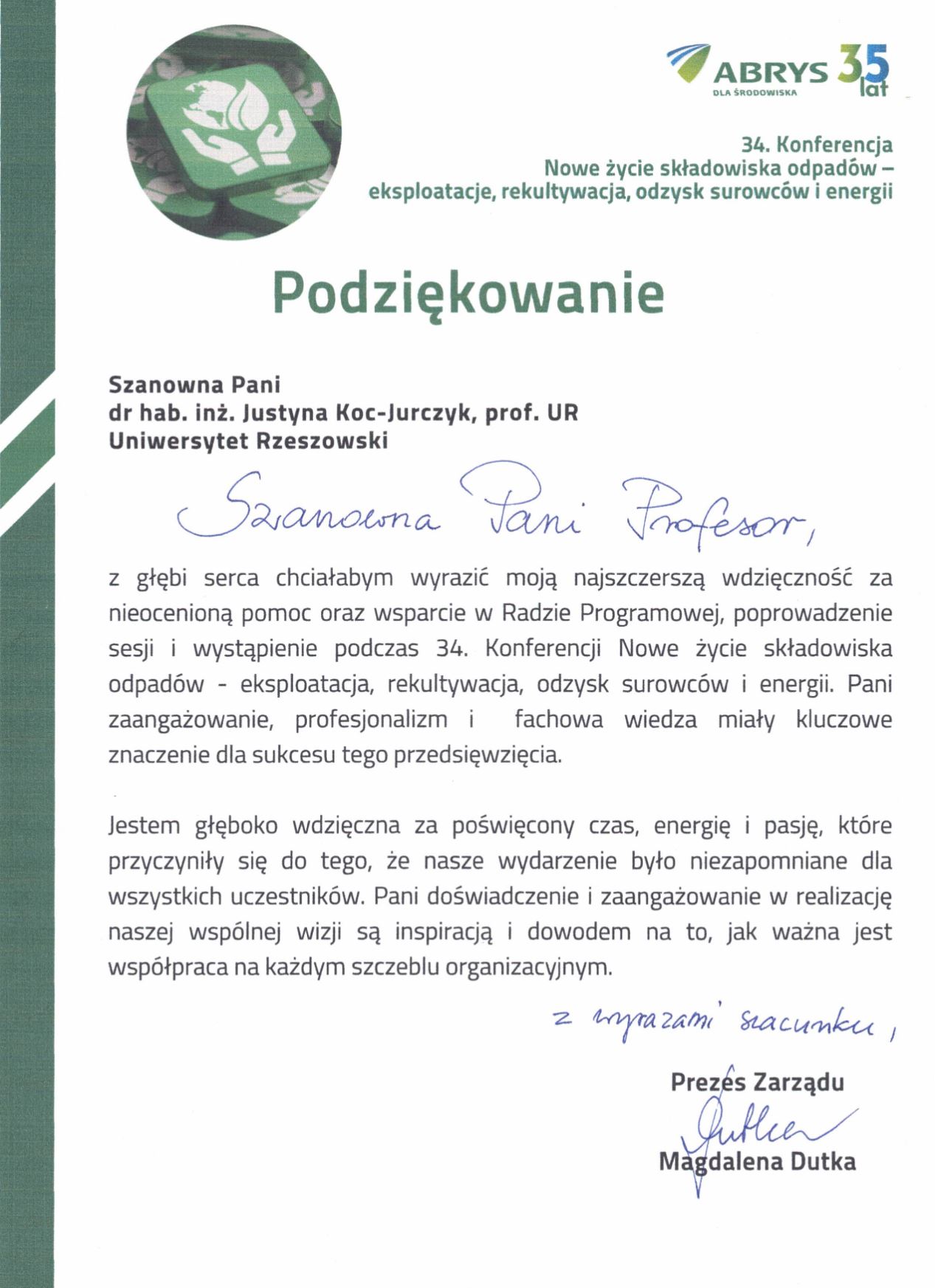Dr hab. inż. Justyna Koc-Jurczyk, prof. UR w Radzie Programowej 34. Konferencji nowe życie składowiska odpadów