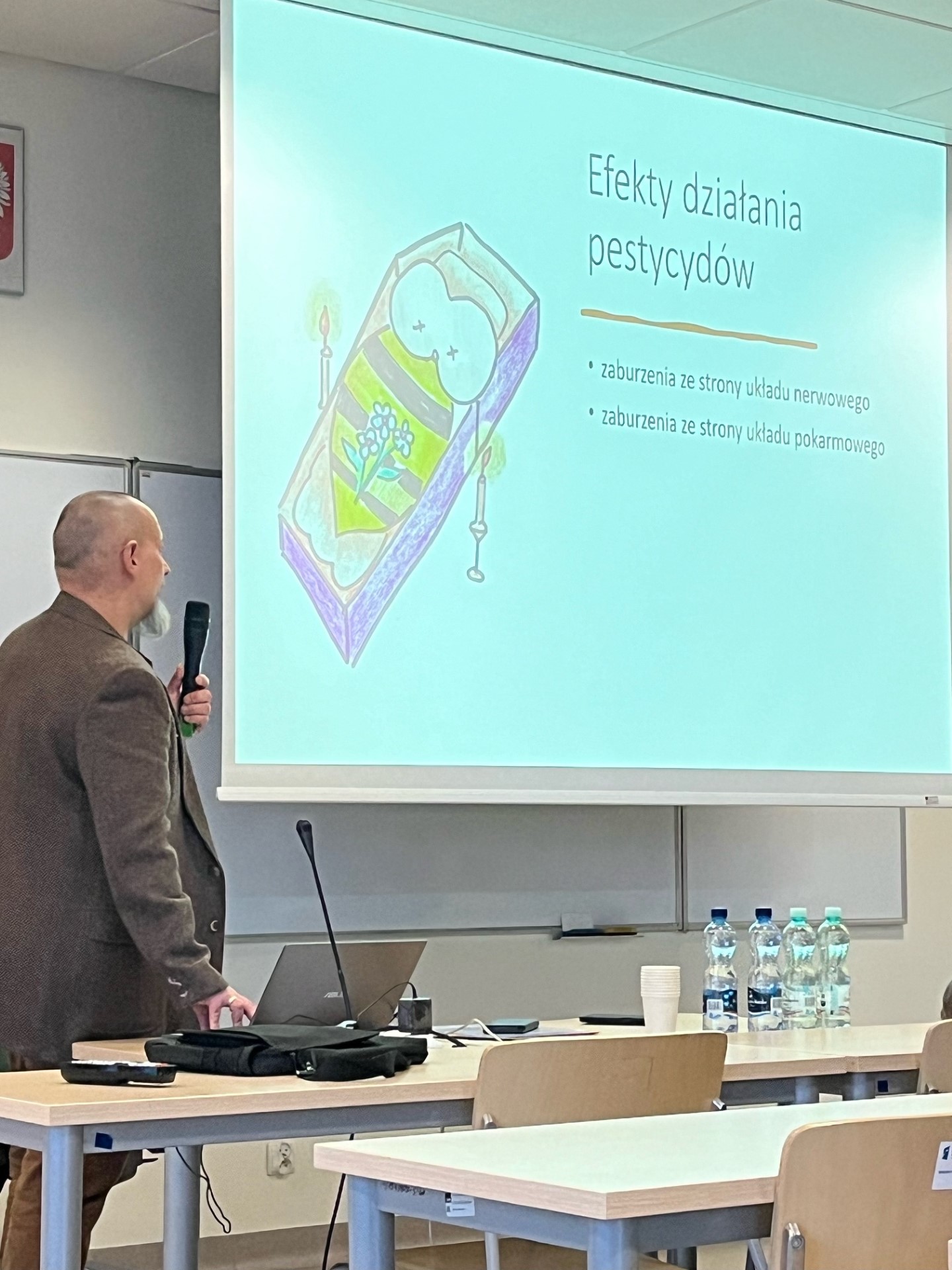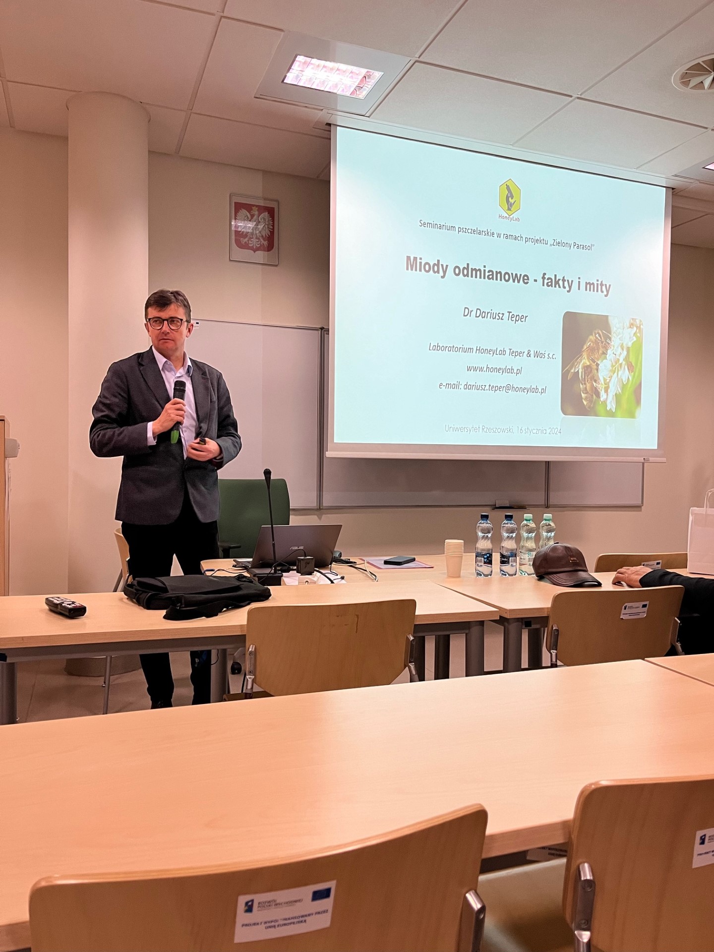 W dniu 16.01.2024 w Instytucie Technologii Żywności i Żywienia odbyło się  kolejne seminarium pszczelarskie zorganizowane w ramach projektu "Zielony parasol" finansowanego z Funduszu Promocji Roślin Oleistych KOWR. Do współorganizacji wydarzenia zespół badawczy zajmujący się analizą produktów pszczelich w Zakładzie Chemii i Toksykologii Żywności został zaproszony przez Prezesa Krośnieńskiego Koła Pszczelarzy, Pana Marka Barzyka. Mimo niesprzyjającej pogody udział w spotkaniu wzięło 50 osób, w tym głównie pszczelarze z Podkarpacia  a także zainteresowani pracownicy i studenci UR.
