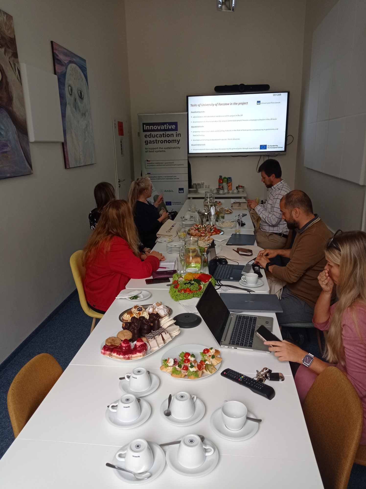 Tematem przewodnim spotkania było omówienie dotychczasowych postępów w ramach zakończonego pierwszego etapu projektu, które dotyczyły przygotowanych dwujęzycznych materiałów dydaktycznych z zakresu gastronomii oraz technologii żywności, a także omówienie budżetu projektu.