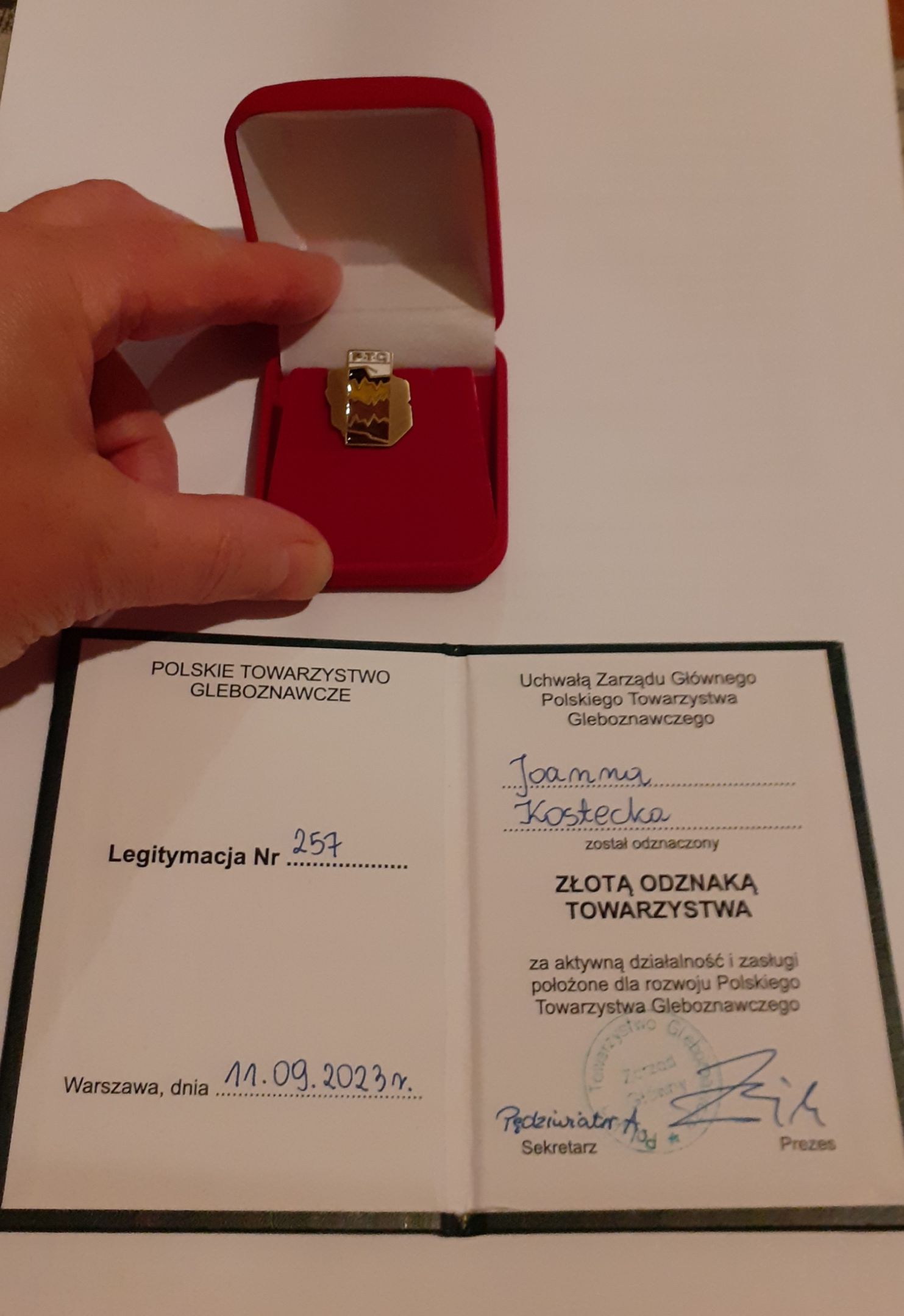 Z przyjemnością informujemy, że Zarząd Główny Polskiego Towarzystwa Gleboznawczego podjął uchwałę o uhonorowaniu Pani prof. dr hab. Joanny Kosteckiej z Zakładu Podstaw Rolnictwa i Gospodarki Odpadami w Kolegium Nauk Przyrodniczych, Złotą Odznaką PTG. Wręczenie Odznak odbyło się we wrześniu 2023 r. podczas Walnego Zebrania Delegatów PTG.