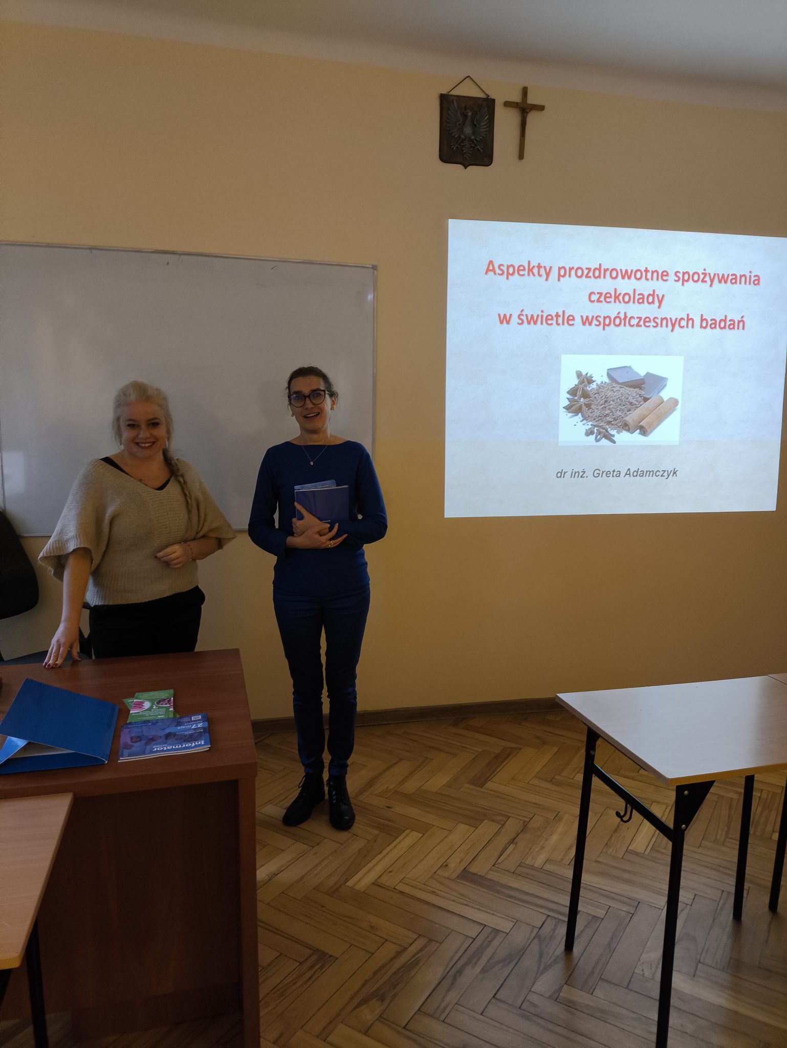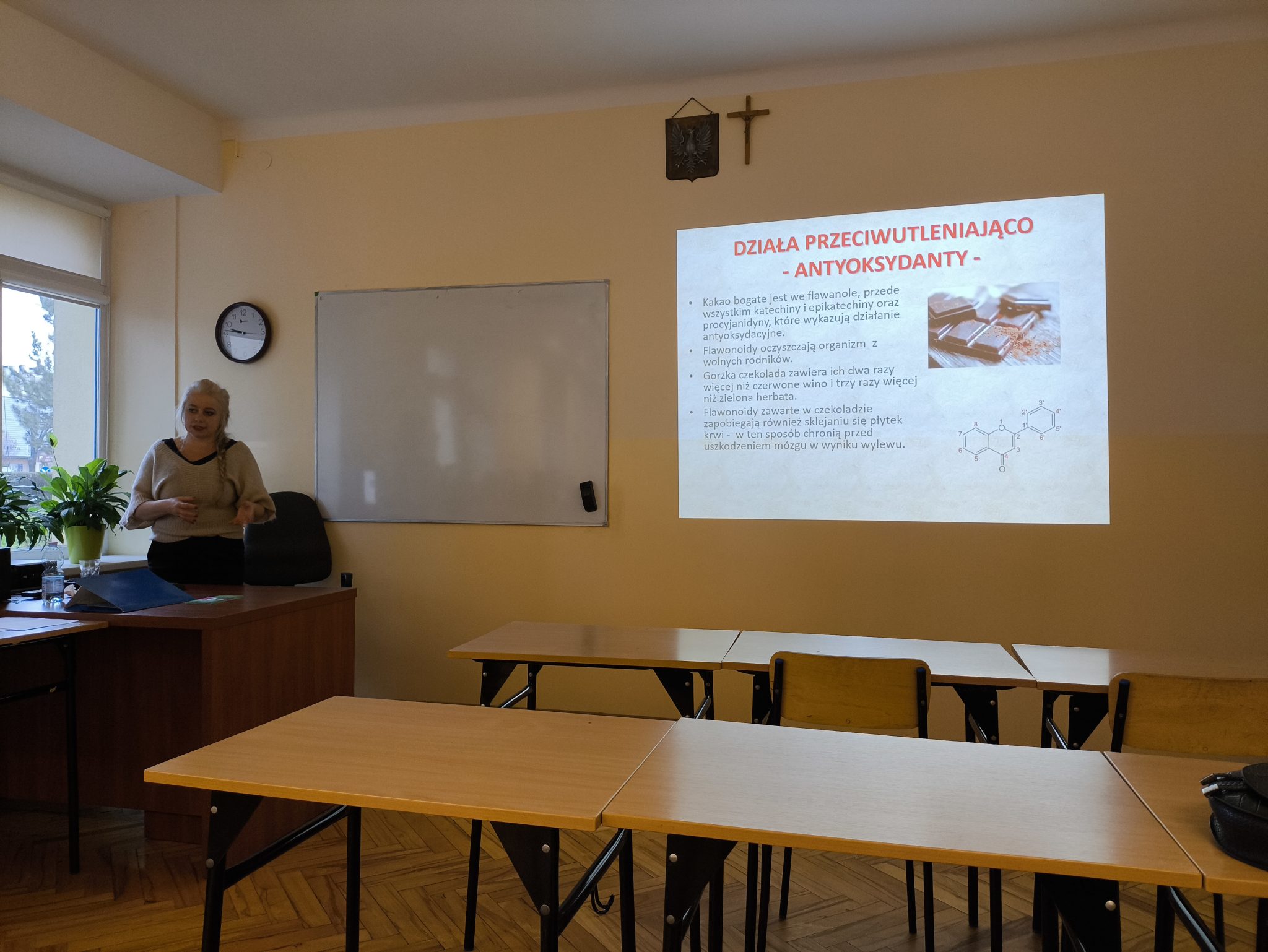20 listopada 2024 r. uczniowie z klas 2B i 4B Zespołu Szkół nr 3 im. Tadeusza Rylskiego w Rzeszowie wzięli udział w wykładzie „Aspekty prozdrowotne spożywania czekolady w świetle współczesnych badań”, który wygłosiła pani dr inż. Greta Adamczyk z Instytutu Technologii Żywności i Żywienia Uniwersytetu Rzeszowskiego.