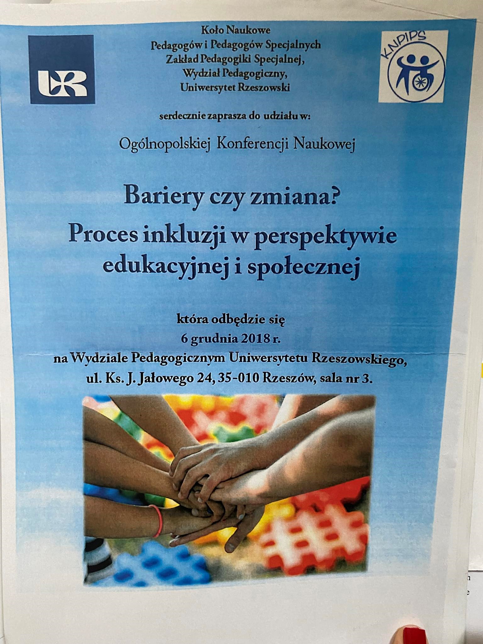 Szczególnym wydarzeniem dla studentów Koła była organizacja Studenckiej Konferencji Naukowej pt. „ Metody i formy pracy z dziećmi i młodzieżą z niepełnosprawnością”, która odbył się 19 grudnia 2016 roku, jako zwieńczenie pracy studentów koła na projektem realizowanym w tym roku pod tym samym tytułem. Konferencja miała wymiar szczególny, gdyż była pod patronatem Dziekana Wydziału Pedagogicznego Prof. dr hab. Ryszarda Pęczkowskiego a w konferencji uczestniczył J. M. Rektor UR Prof. dr hab. Sylwester Czopek. W części wstępnej Konferencji studenci zaprezentowali interesujący program świąteczny prezentując ballady świąteczne własnego autorstwa. W Sympozjum uczestniczyli studenci nie tylko Uniwersytetu Rzeszowskiego, ale i studenci wielu innych Uczelni, w tym również studenci niepełnosprawni. Tematyka wystąpień koncentrowała się wokół zagadnień dotyczących: terapii w pracy z dziećmi z niepełnosprawnością, form pracy z dziećmi z niepełnosprawnością oraz metod, sposobów pracy z dziećmi z niepełnosprawnością oraz z rodziną dziecka z niepełnosprawnością. Pokołosiem tego wydarzenia jest złożona do druku monografia z tekstami studentów recenzowana przez Prof. dr hab. Piotra Majewicza z AP w Krakowie.