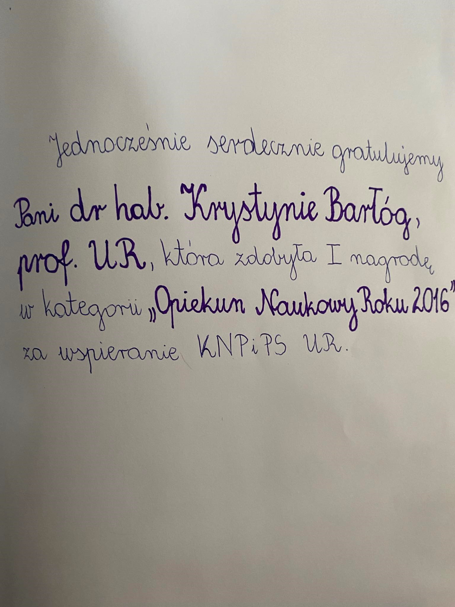 - I nagroda dla dr hab. prof. nadzw. UR Krystyny Barłóg w kategorii Opiekun Naukowy Roku 2016;