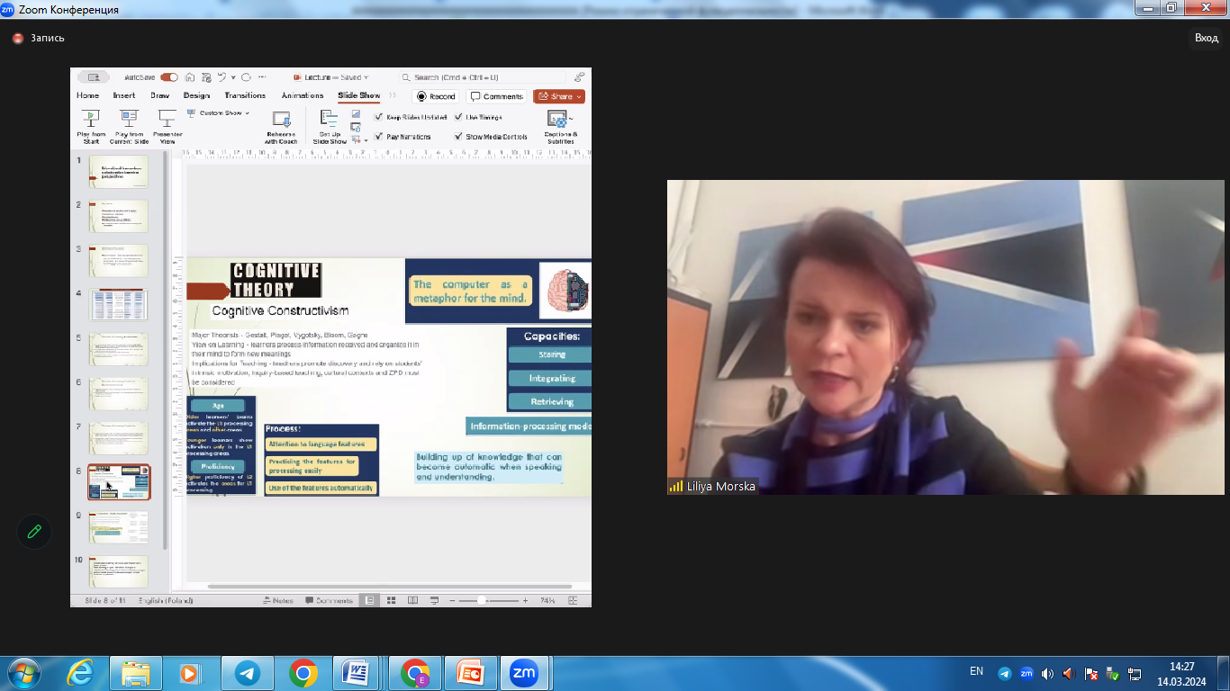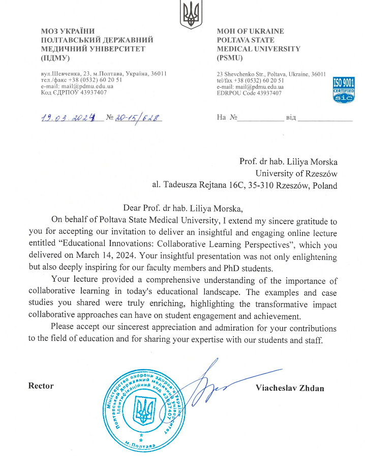 14 marca 2024 roku Prof dr hab. Liliya Morska z Instytutu Pedagogiki UR, jako specjalny zagraniczny gość, w ramach podpisanej w grudniu ubiegłego roku umowy o współpracy pomiędzy Uniwersytetem Rzeszowskim a Państwowym Uniwersytetem Medycznym w Połtawie, wygłosiła wykład dla doktorantów i studentów pt.: Educational Innovations: Collaborative Learning Perspectives. Doktoranci to przedstawicieli różnych kierunków studiów – w zakresie nauk ścisłych i humanistycznych. Tematyka wykładu odzwierciedla współczesne wyzwania stojące przed uczelniami wyższymi, które potrzebują pilnych rozwiązań.