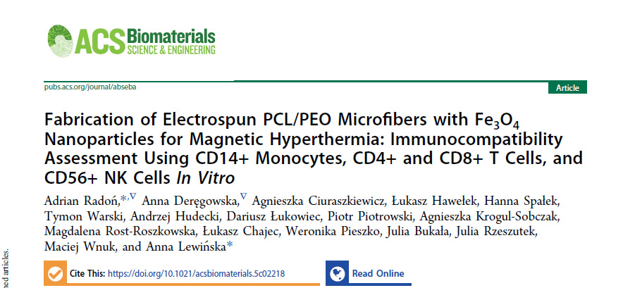 Praca zatytułowana „Fabrication of Electrospun PCL/PEO Microfibers with Fe3O4 Nanoparticles for Magnetic Hyperthermia: Immunocompatibility Assessment Using CD14+ Monocytes, CD4+ and CD8+ T Cells, and CD56+ NK Cells In Vitro” powstała w ramach szerokiej współpracy z Politechniką Śląską, Uniwersytetem Śląskim w Katowicach, Uniwersytetem Warszawskim oraz Siecią Badawczą Łukasiewicz – Instytutem Metali Nieżelaznych. Badania koncentrowały się na wytworzeniu innowacyjnych mikrowłókien polimerowych wzbogaconych nanocząstkami magnetytu do zastosowań w hipertermii magnetycznej. Kluczowym elementem publikacji była szczegółowa ocena wpływu tych mikrowłókien na ludzkie komórki układu odpornościowego oraz analiza ich biokompatybilności, co stanowi istotny krok w projektowaniu bezpiecznych systemów dostarczania leków.