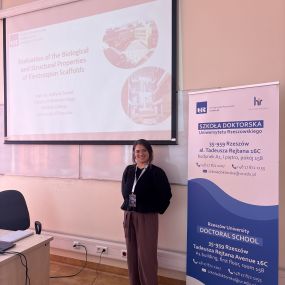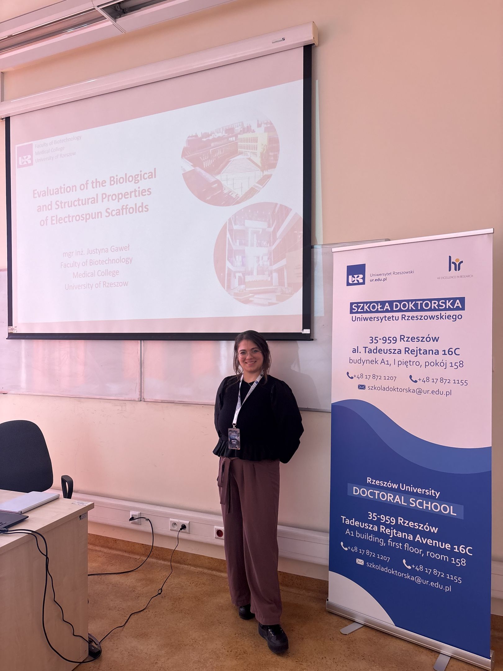 - mgr inż. Justynę Gaweł – doktorantka oraz współorganizatorka konferencji, która poprowadziła panel „Materia —> Metody —> Biomedycyna”. Zaprezentowała również wyniki swoich badań pt. „Evaluation of the Biological and Structural Properties of Electrospun Scaffolds”, które wykazują wysoki potencjał aplikacyjny.