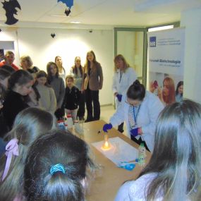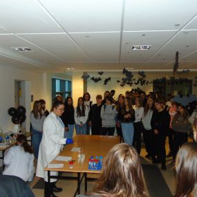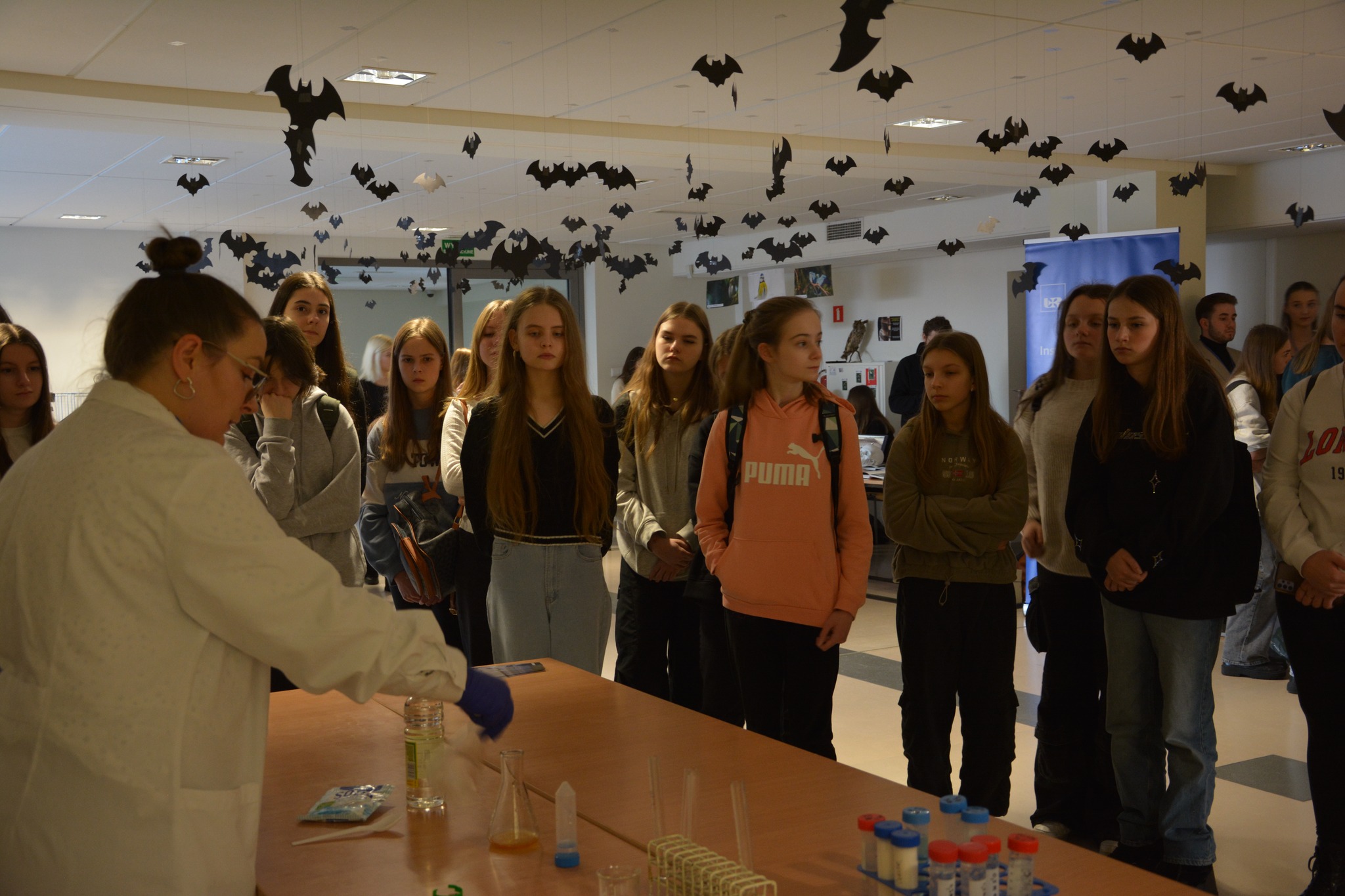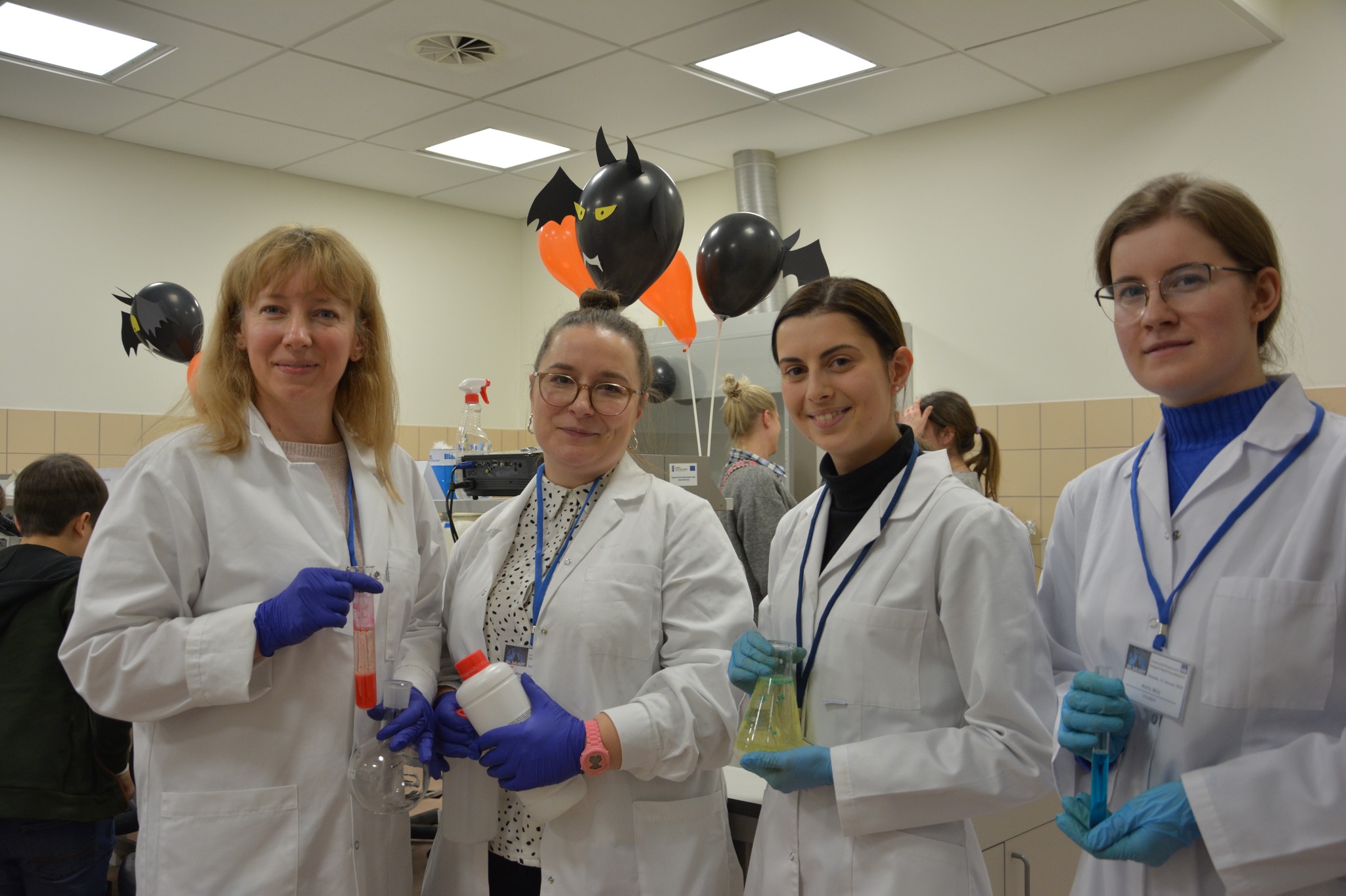 Ale to nie wszystko... Na korytarzach budynku nasze koleżanki-chemiczki oraz studentki prezentowały doświadczenia chemiczne a SKN Bio-Tech miało również pokazy fizyko-chemiczne.
