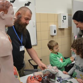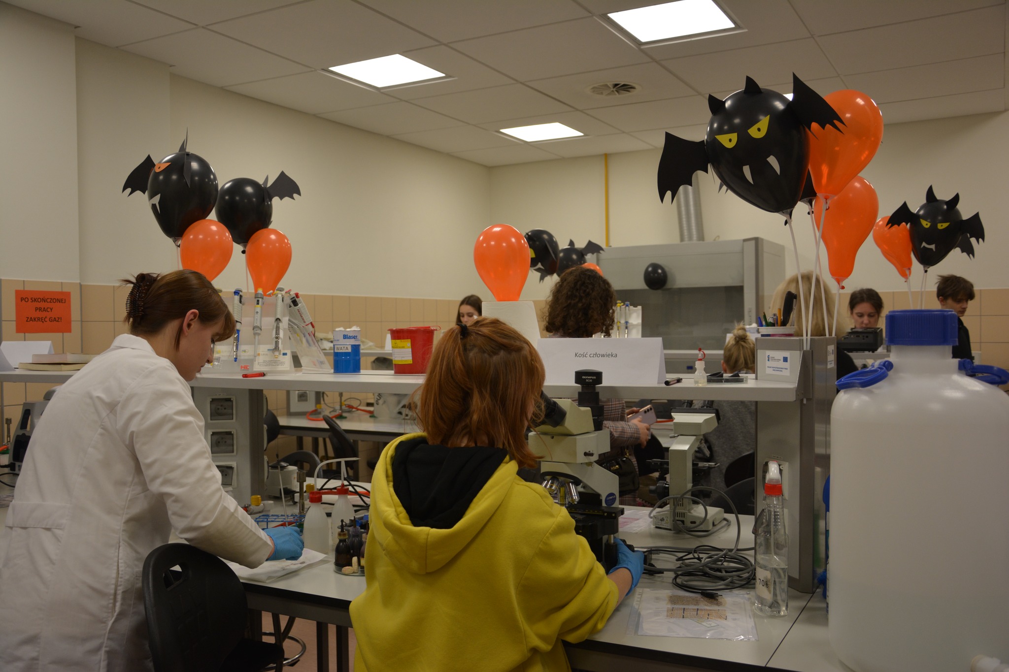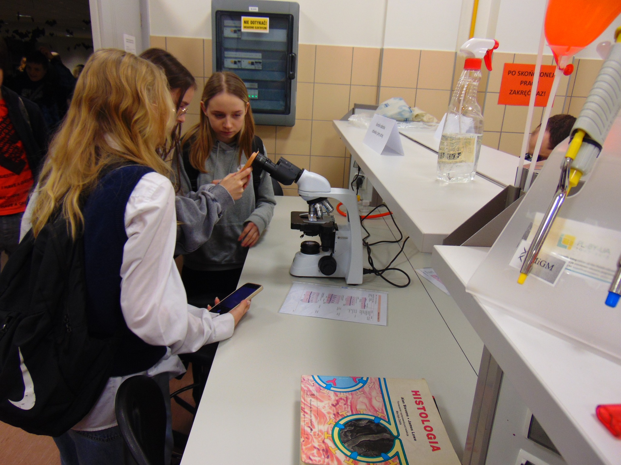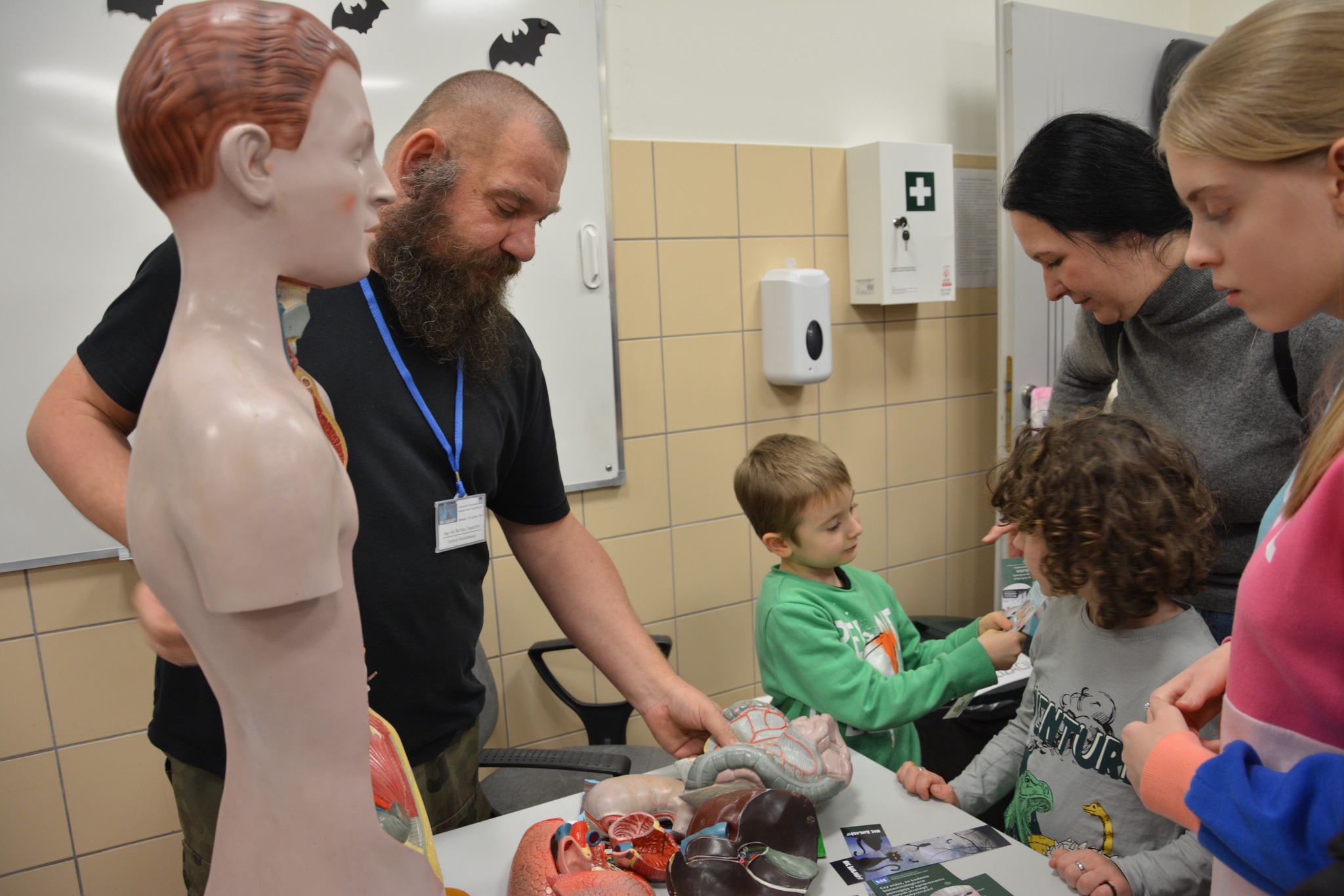 W ramach pokazów prezentowaliśmy metody barwienia bakterii, rodzaje bakterii oraz podłoży, na których je hodujemy. Było to bardzo ciekawe przeżycie dla uczniów ze szkoły podstawowej. Następnie anatomię człowieka w skali makro (model dydaktyczny) oraz mikro (preparaty mikroskopowe tkanek oraz atlasy histologiczne) poznawali odwiedzający nas uczniowie, nauczyciele, rodzice oraz inni uczestnicy. Przez cały czas na sali panował ruch i mieliśmy liczne grono oglądających, pytających i dyskutujących o anatomii i histologii 🙂