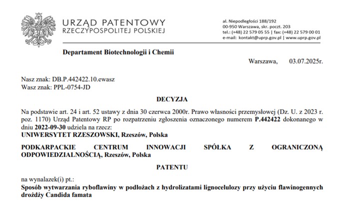 We are pleased to announce that a research team from the Faculty of Biotechnology at the University of Rzeszów has been granted a patent for an innovative method of riboflavin (vitamin B₂) production.
