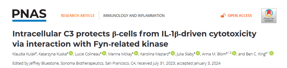 Kulak K, Kuska K, Colineau L, Mckay M, Maziarz K, Slaby J, Blom AM, King BC. Intracellular C3 protects β-cells from IL-1β-driven cytotoxicity via interaction with Fyn-related kinase. Proc Natl Acad Sci U S A. 2024 Feb 20;121(8):e2312621121. doi: 10.1073/pnas.2312621121.