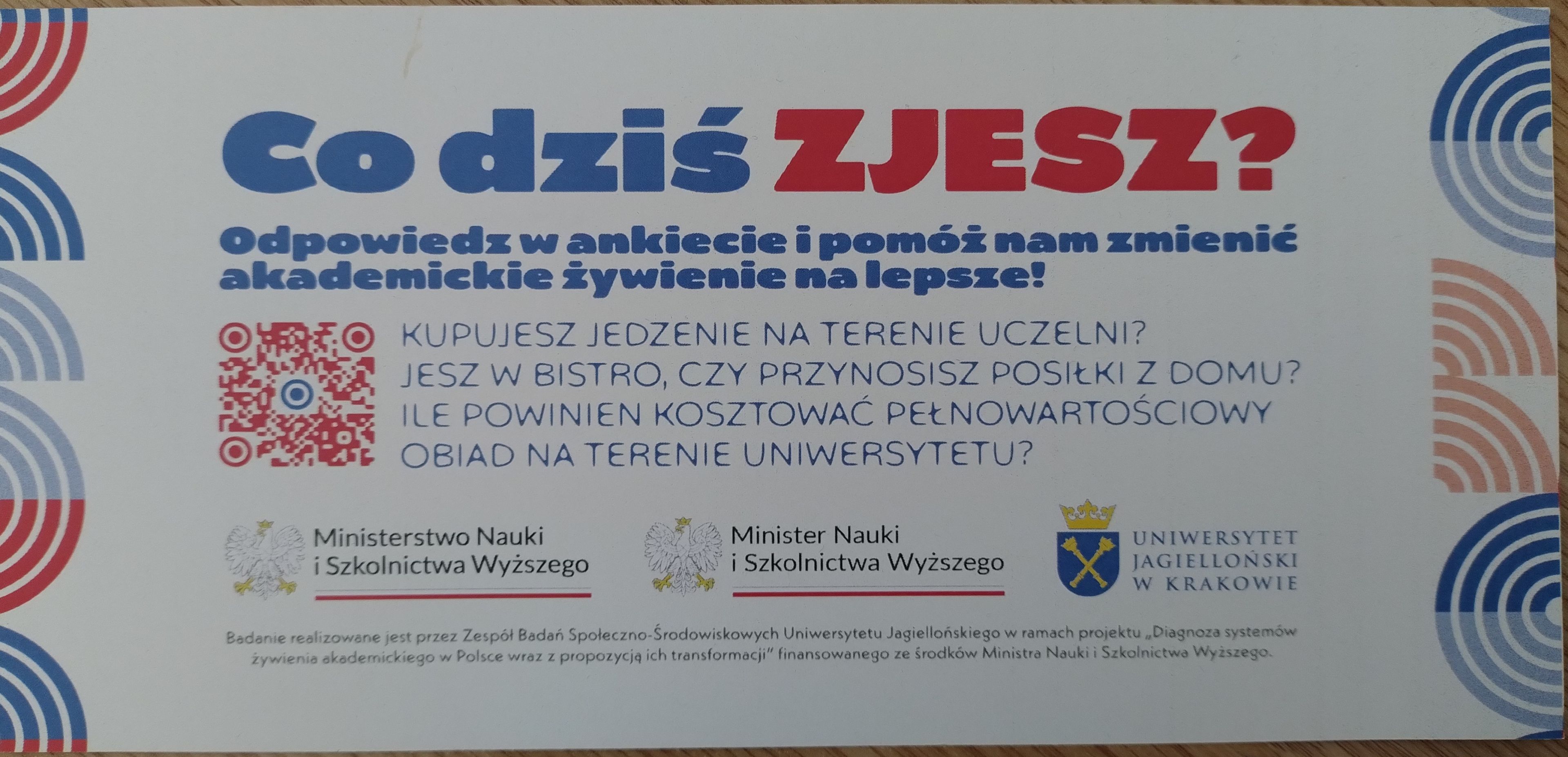Uniwersytet Rzeszowski przy współpracy z Uniwersytetem Jagiellońskim prowadzi obecnie badania w ramach projektu „Diagnoza systemów żywienia akademickiego w Polsce wraz z propozycją ich transformacji”. Bardzo gorąco zachęcam Państwa do wzięcia udziału w tych badaniach i wyrażenia swojej opinii na temat zwyczajów i potrzeb żywieniowych na Naszej Uczelni. Poświęcenie chwili czasu na wypełnienie ankiety może przynieść korzyści całej Naszej Społeczności Akademickiej.