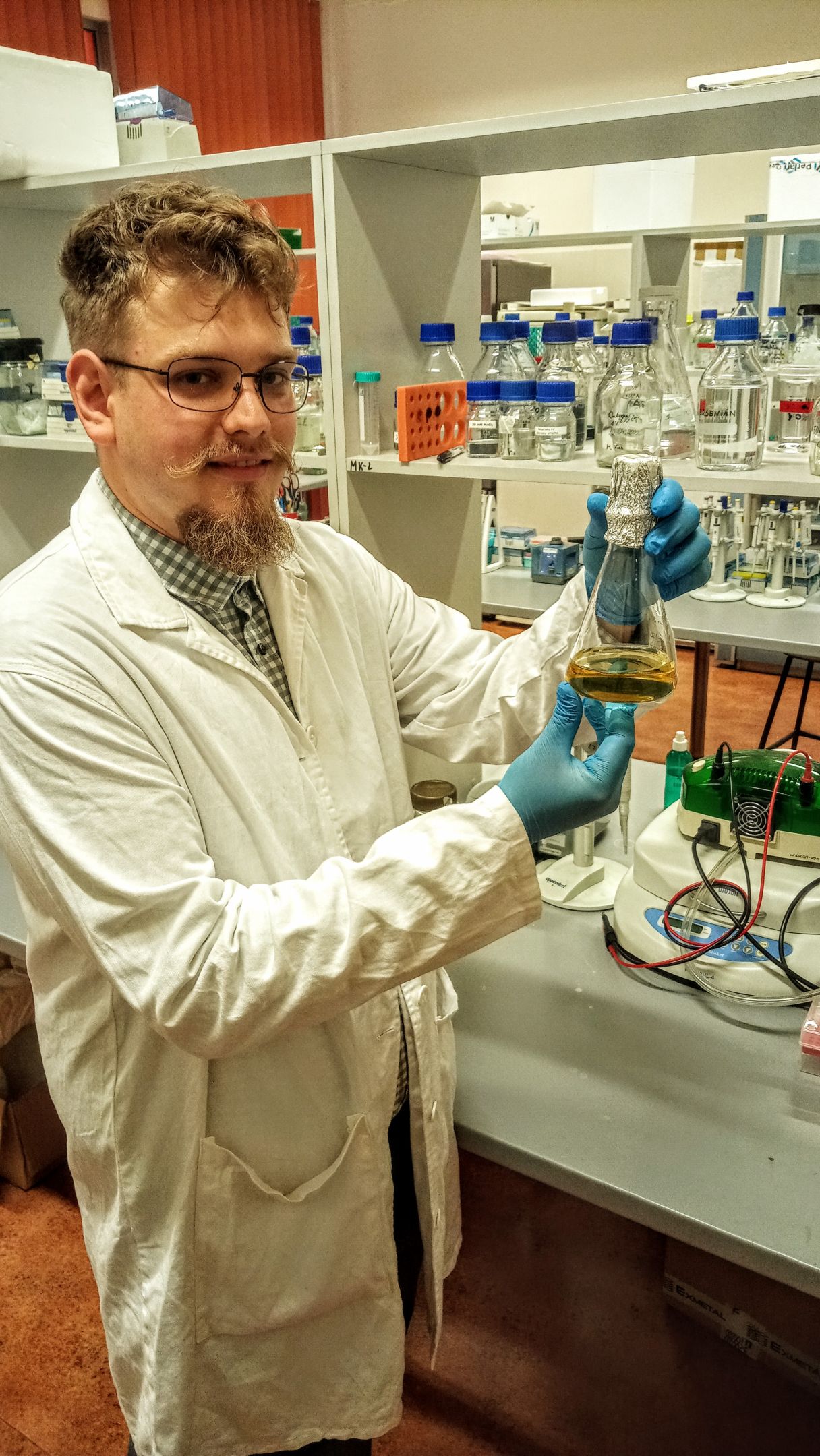 Moja przygoda ze studiowaniem biotechnologii zaczęła się od wykładu z chemii ogólnej i nieorganicznej prowadzonego przez Pana dr hab. Roberta Pązika, profesora UR. Pamiętam, że czułem ogromne podekscytowanie będąc na pierwszym w swoim życiu wykładzie z krwi i kości. Chociaż tutaj muszę nadmienić, że chwilę mi zajęło przestawienie się z uczenia na studiowanie (różnica jest dość znacząca). Wracając jednak do zadanego pytania, to taka faktyczna przygoda z biotechnologią myślę, że rozpoczęła się, kiedy to na innym wykładzie z biologii roślin u dr hab. Łukasza Łuczaja, profesora UR mieliśmy przyjemność gościć Pana mgr Konrada Wysockiego, który przyjechał w ramach wymiany studenckiej Fulbright. Pan Konrad szukał chętnych studentów do pomocy przy prowadzeniu badań na dzikich odmianach polskiego chmielu zwyczajnego. Zgłosiłem się i dzięki temu praktycznie od początku studiów miałem możliwość poznać, jak wyglądają badania naukowe, jak istotnym jest dokładne przeczytanie setek publikacji naukowych, żeby zrozumieć dany temat oraz jaką przyjemność daje poświęcenie swojego czasu i zaangażowania, kiedy ma się możliwość prezentowania wyników przeprowadzonych przez siebie badań na konferencjach naukowych.