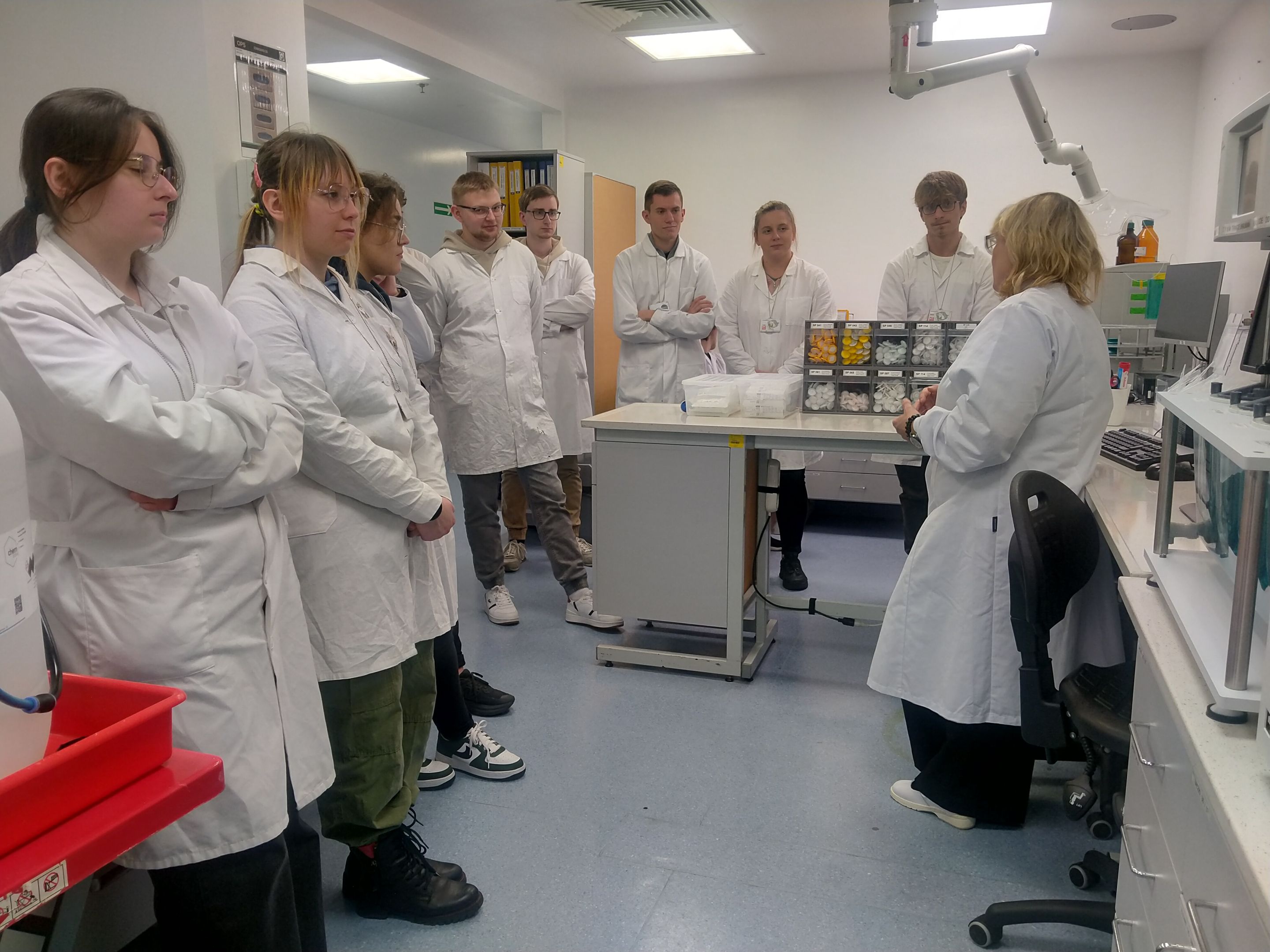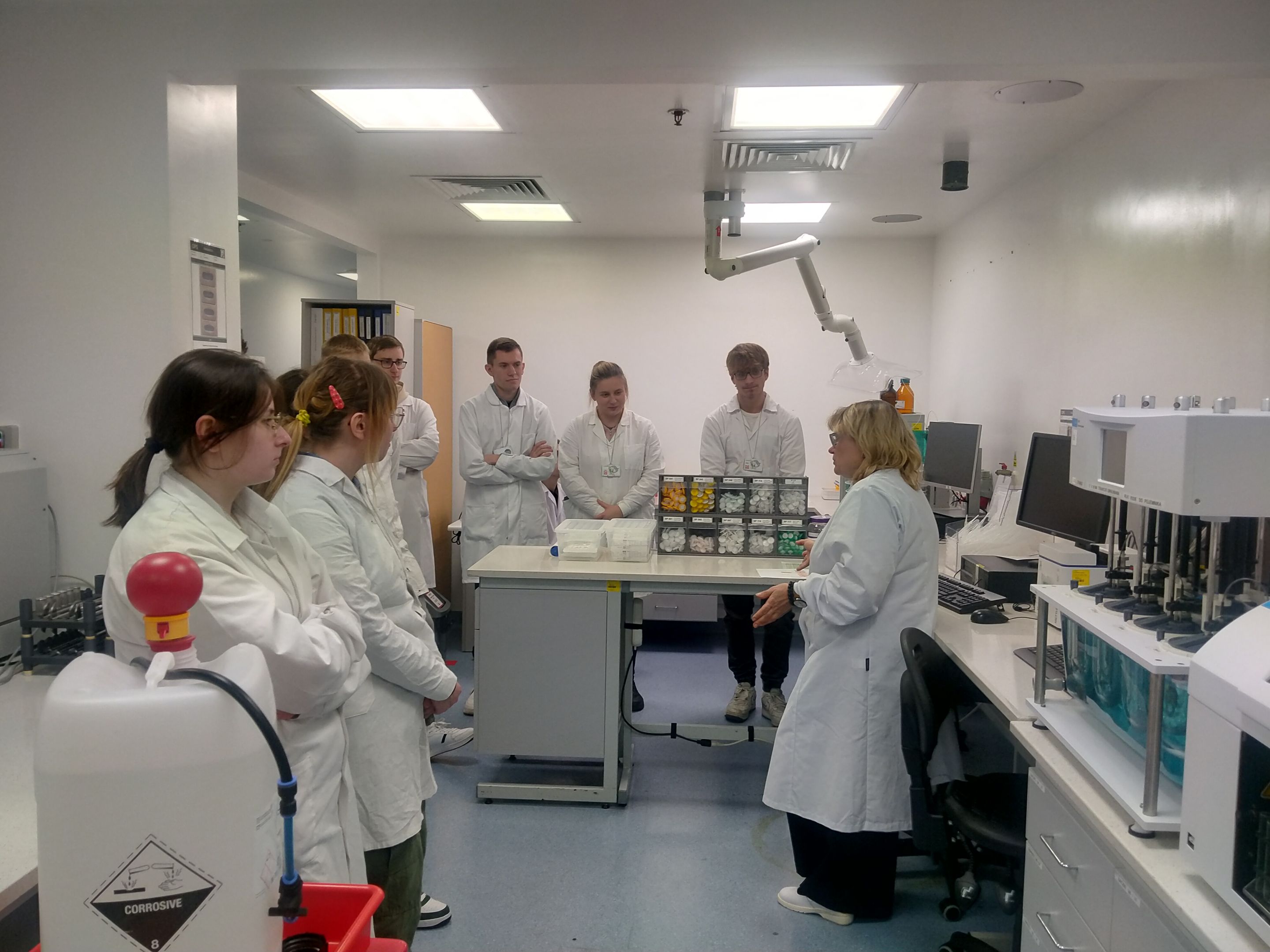 Zajęcia zostały przeprowadzone przez panią Mirosławę Kwasek - Kierownika Kontroli Jakości ds. Produktów, specjalistkę z wieloletnim doświadczeniem w zakresie systemów jakości i nadzoru nad procesami produkcyjnymi. Spotkanie miało charakter merytoryczny i obejmowało zarówno część teoretyczną, jak i elementy praktyczne, odnoszące się do realiów pracy w zakładzie farmaceutycznym.