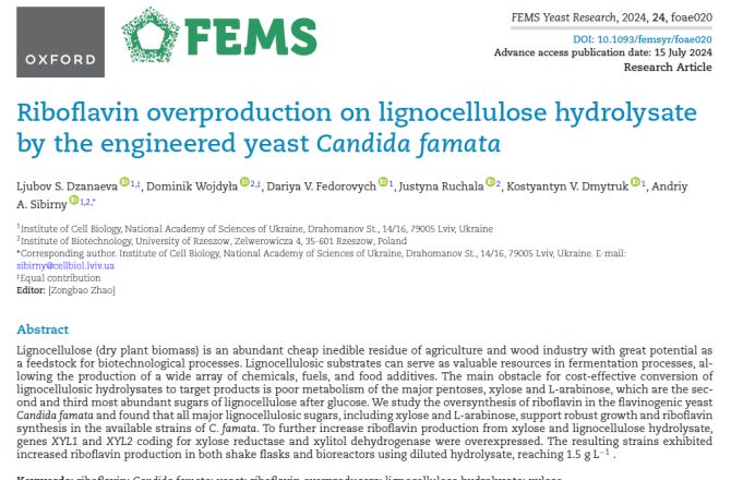Z satysfakcją informujemy, że zespół badawczy naszego instytutu pod kierownictwem dr hab. Justyny Ruchały, prof. URz opublikował przełomową pracę naukową w jednym z najbardziej cenionych czasopism naukowych FEMS Yeast Research. Artykuł, przygotowany we współpracy z Instytutem Biologii Komórki Narodowej Akademii Nauk Ukrainy, dotyczy innowacyjnych badań nad biotechnologiczną produkcją ryboflawiny (witaminy B2) przez modyfikowane szczepy drożdży Candida famata.