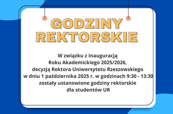 W związku z Inauguracją Roku Akademickiego 2025/2026 , decyzją Rektora Uniwersytetu Rzeszowskiego w dniu 1 października 2025 r. w godzinach 9:30 - 13:30 zostały ustanowione godziny rektorskie dla studentów UR.