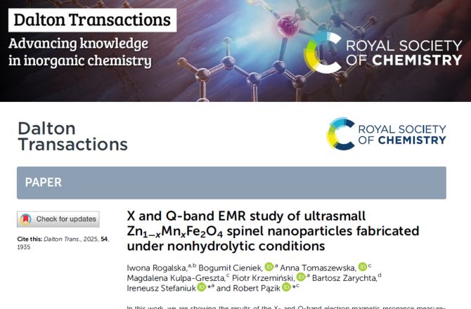 Z ogromną przyjemnością informujemy, że artykuł zespołu badawczego prof. dr hab. Roberta Pązika został wyróżniony jako HOT Article w prestiżowym czasopiśmie Dalton Transactions (Royal Society of Chemistry) z dziedziny chemii nieorganicznej!