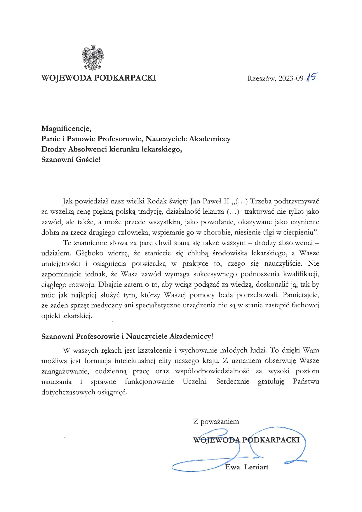 Już po raz trzeci odbyło się uroczyste Dyplomatorium absolwentów Kierunku Lekarskiego Kolegium Nauk Medycznych Uniwersytetu Rzeszowskiego. W pięknej scenerii Filharmonii Podkarpackiej, w dniu 24.09.2023 r., 132 młodych lekarzy odebrało pamiątkowe dyplomy. Podczas uroczystości wszyscy młodzi adepci medycyny, w obecności Prezesa Okręgowej Izby Lekarskiej w Rzeszowie - Pana Doktora Krzysztofa Marchewki, złożyli Przyrzeczenie Lekarskie. Tym samym zobowiązali się do „służenia życiu i zdrowiu ludzkiemu”.