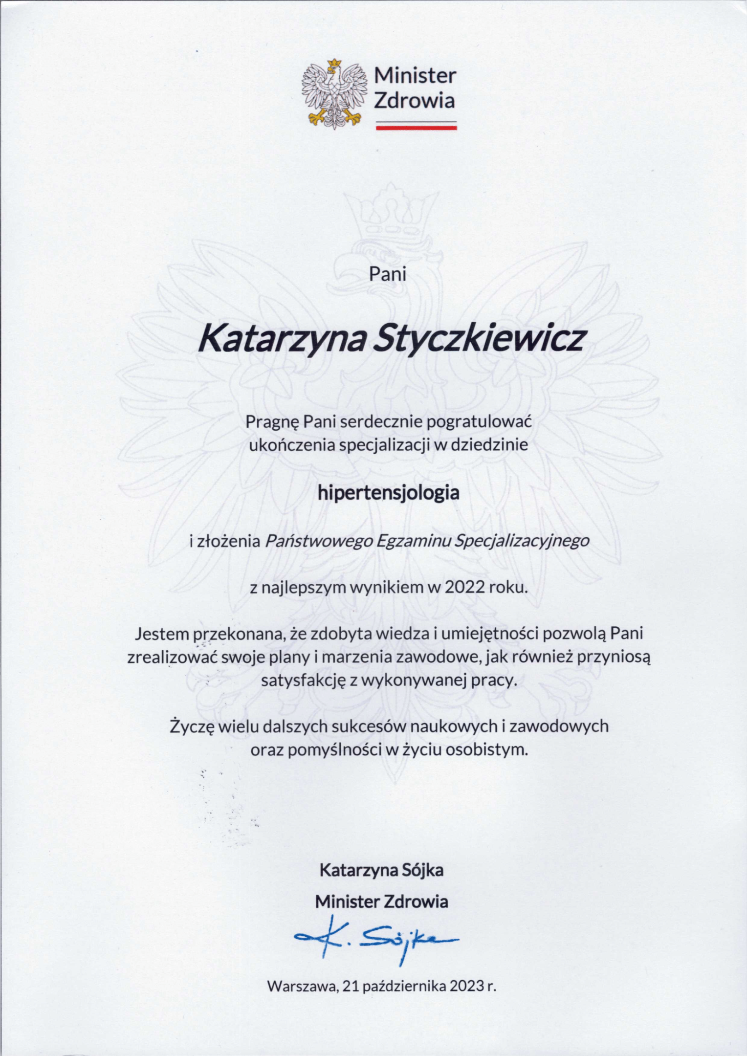 Jest nam niezmiernie miło poinformować, iż Pani dr hab. n. med. Katarzyna Styczkiewicz, prof. UR otrzymała List Gratulacyjny od Ministra Zdrowia za uzyskanie najlepszego wyniku z egzaminu specjalizacyjnego z hipertensjologii w 2022 roku. Jest to już trzecia specjalizacja Pani Profesor!