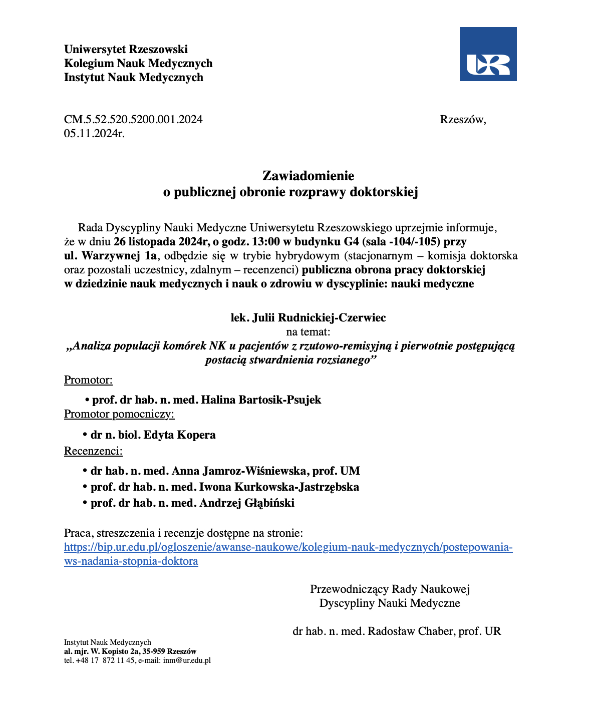 Publiczna Obrona Doktorska - lek. Julia Rudnica - Czerwiec