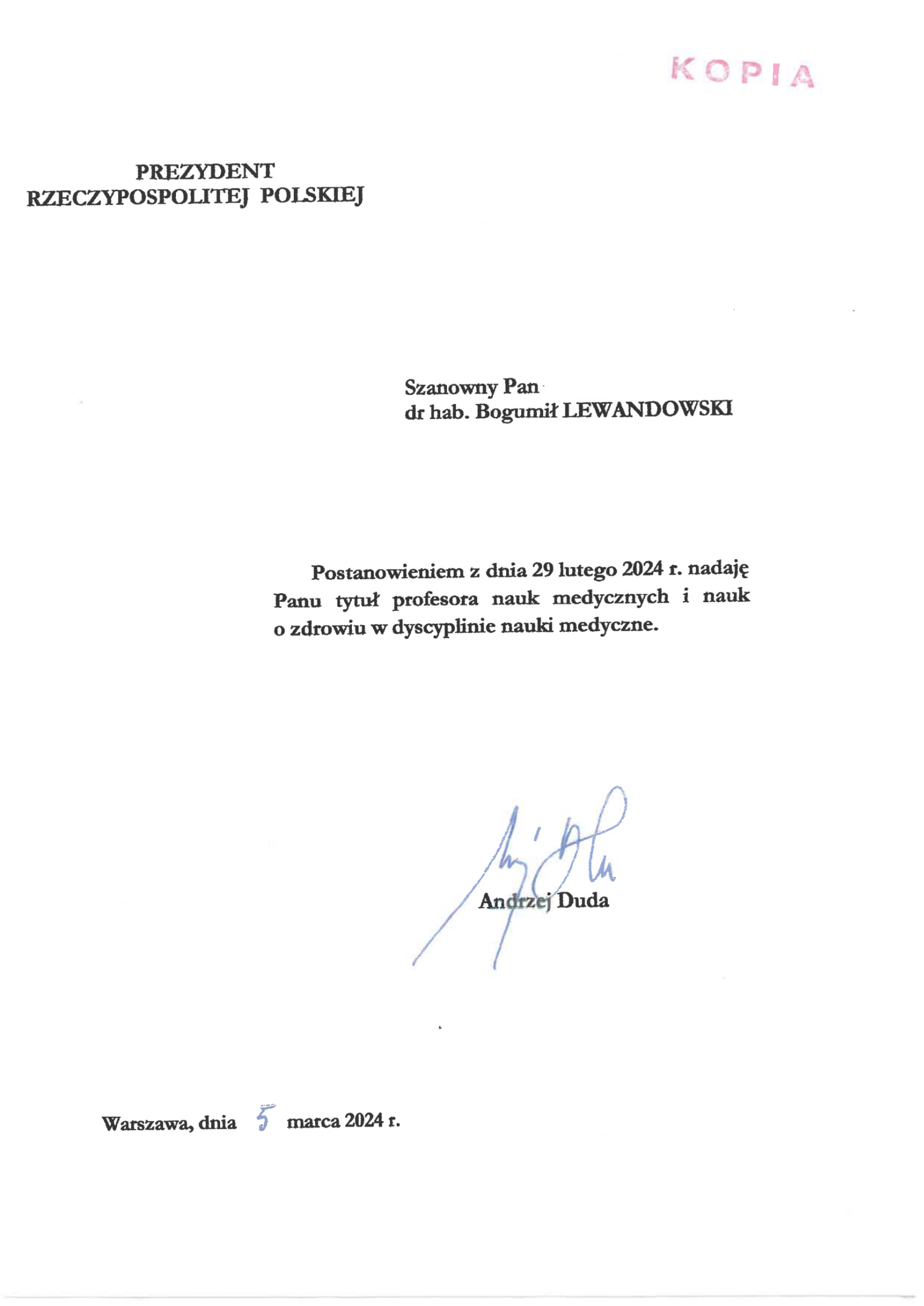 Jest nam niezmiernie miło poinformować, że w dniu 29 lutego postanowieniem Prezydenta Rzeczypospolitej Polskiej Andrzeja Dudy nadano tytuł profesora nauk medycznych i nauk o zdrowiu w dyscyplinie nauki medyczne Panu dr hab. Bogumiłowi Lewandowskiemu.