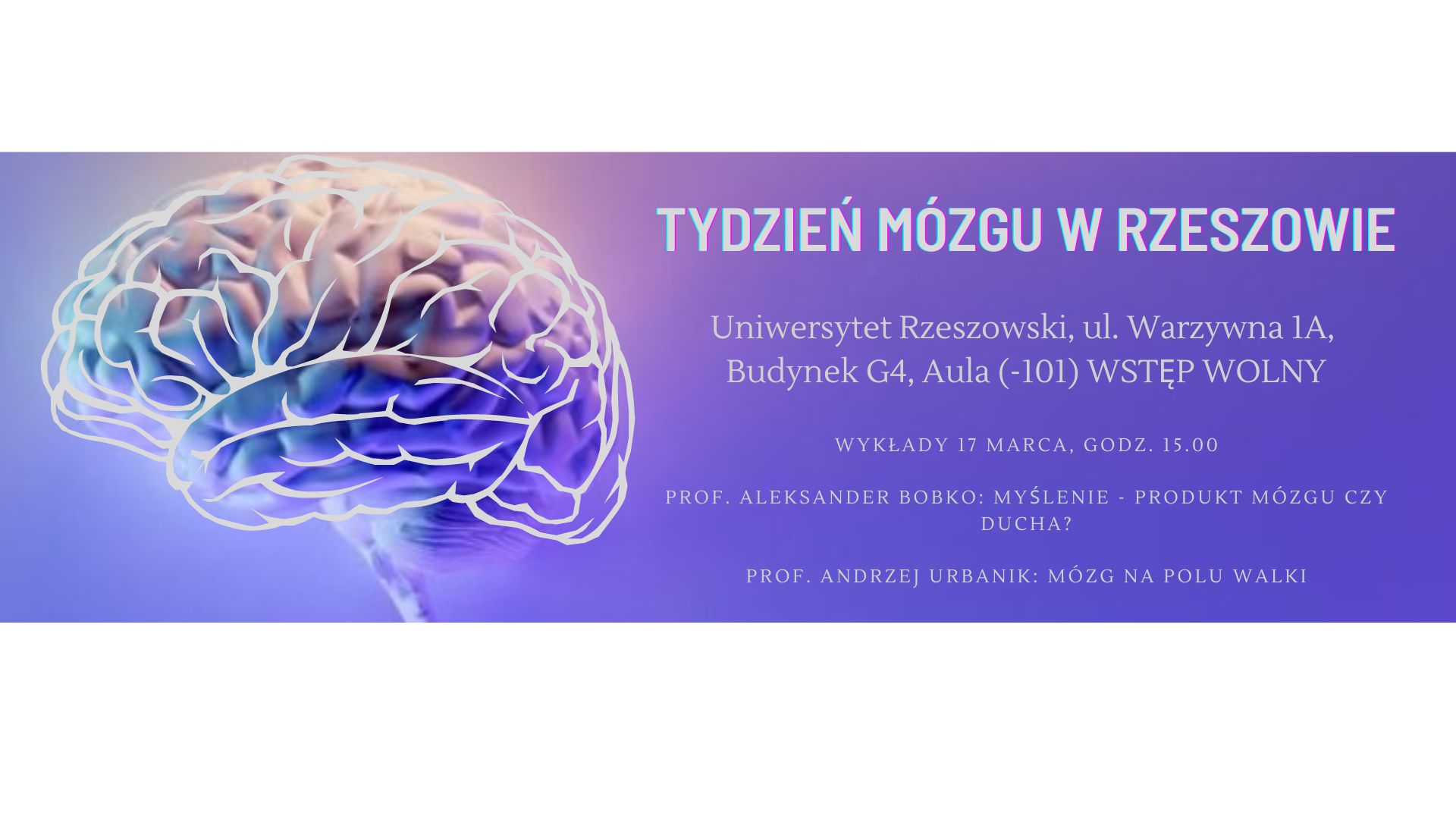 Serdecznie zapraszamy na sesje wykładową z okazji Tygodnia Mózgu. Spotkanie odbędzie się 17 marca o godz. 15.00 w budynku G-4 (ul. Warzywna 1A) Uniwersytetu Rzeszowskiego (Aula -101). Wstęp wolny. W programie wykłady: