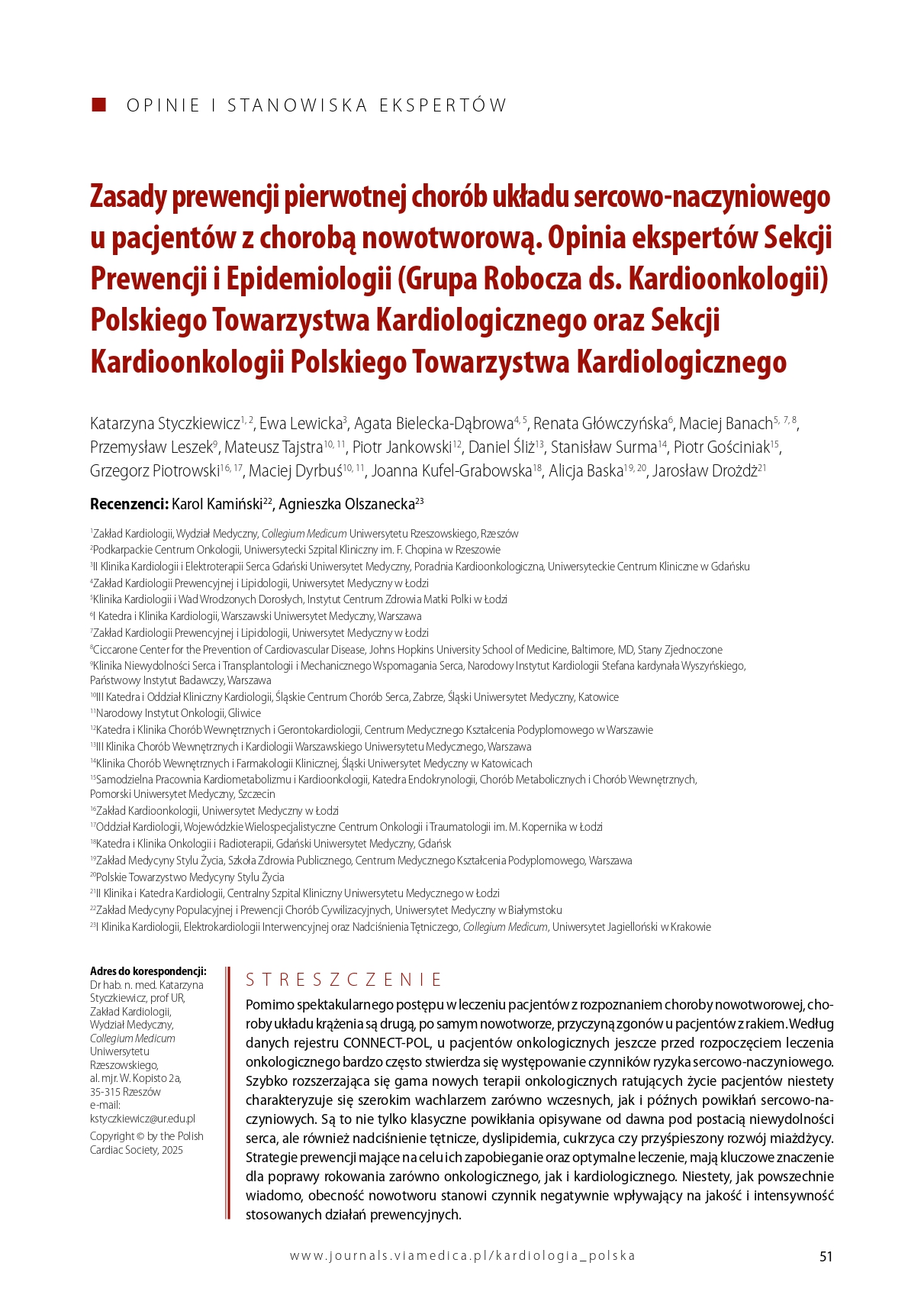 Na łamach Kardiologii Polskiej ukazał się dokument będący opinią ekspertów Polskiego Towarzystwa Kardiologicznego z pierwszym autorstwem Prof. UR K. Styczkiewicz:,, Zasady prewencji pierwotnej chorób układu sercowo-naczyniowego u pacjentów z chorobą nowotworową. Opinia ekspertów Sekcji Prewencji i Epidemiologii (Grupa Robocza ds. Kardioonkologii) PTK oraz Sekcji Kardioonkologii PTK''.  Jest to bardzo ważny dokument podkreślający istotną rolę często zaniedbywanej profilaktyki chorób układu krążenia u pacjentów onkologicznych.